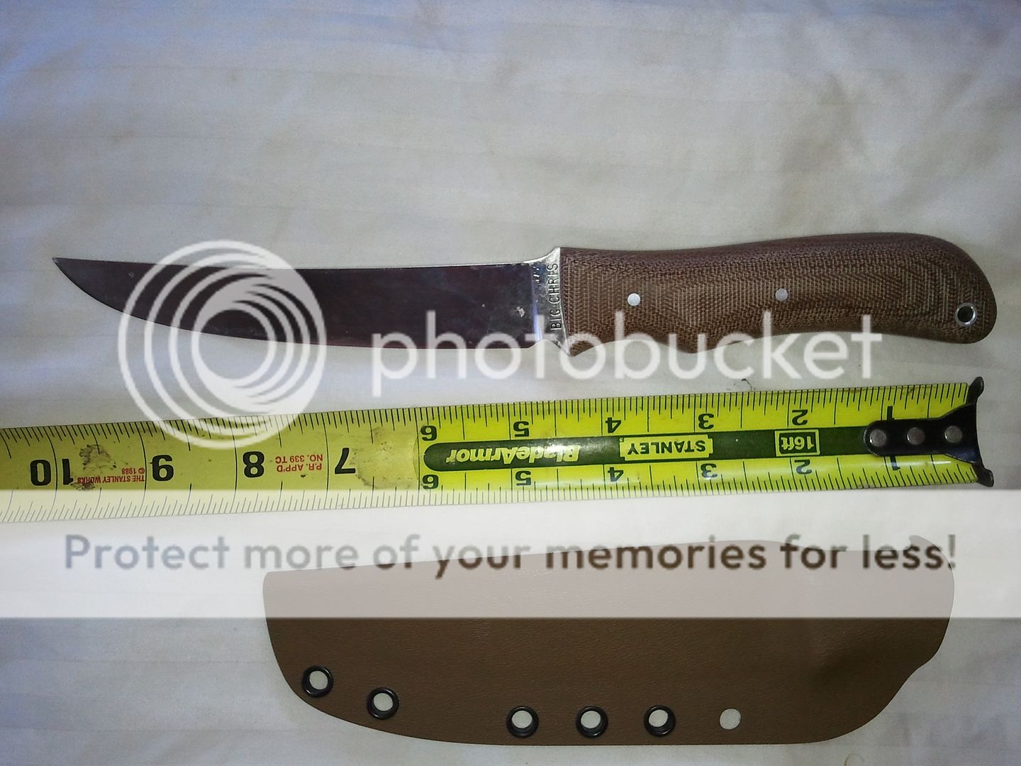 william collins custom butcher knife,got it from maker w/patina on blade,used once to cut rib roast,1095 blade at 1/16 thick,6 1/2 long,11 5/8 total length,no sheath, $50.http://i277.photobucket.com/albums/...3-297a-416e-b21e-94f95bc4a365_zps1112b143.jpg better pic