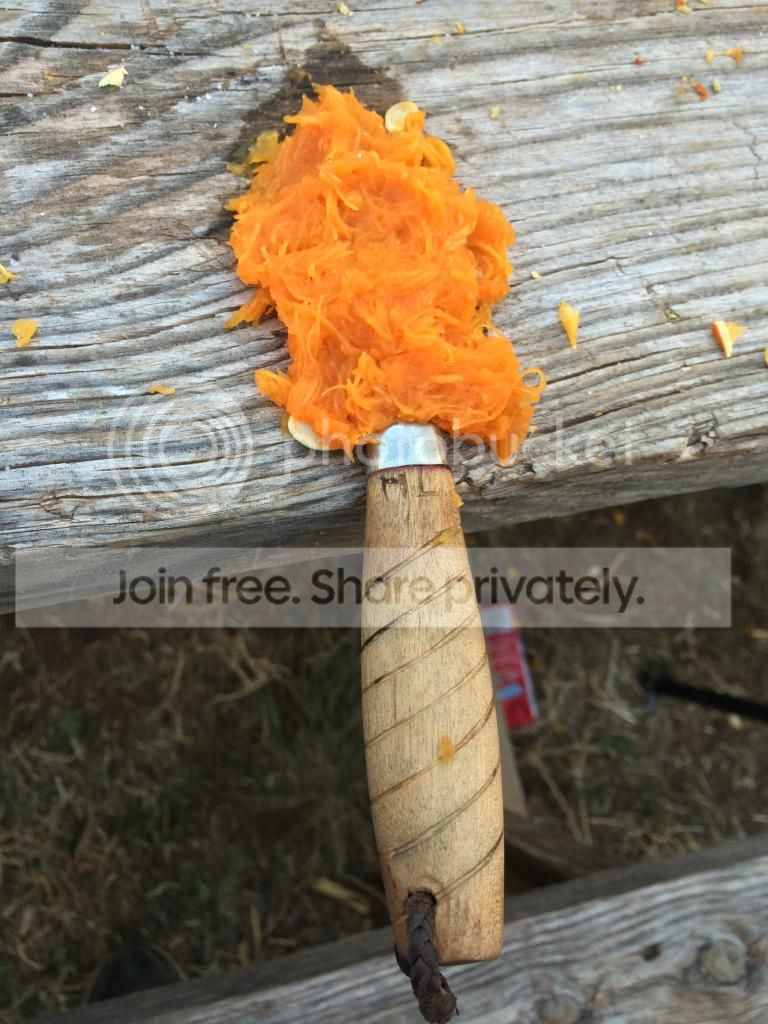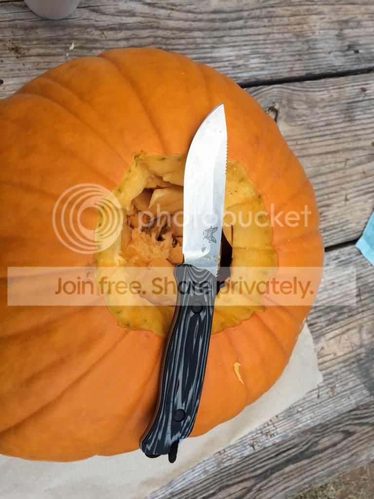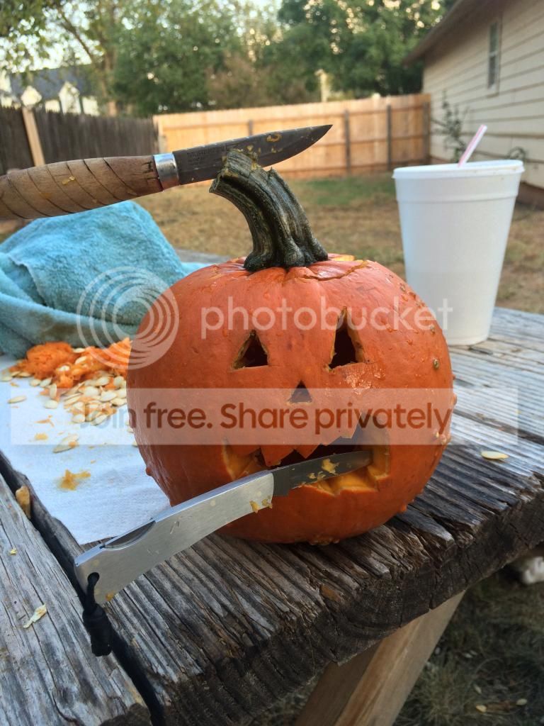 These are the tools I thought I'd need. The RS was so thick it cracked the pumpkin on the first cut.. So the Saddle Mountain Skinner did most of the heavy work on the larger one. My classic Mora #2/0 and BM 940 did the smaller one and my Case executive handled the detail work.