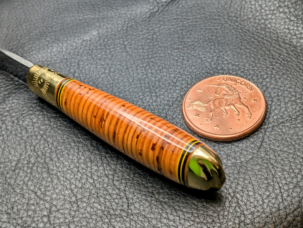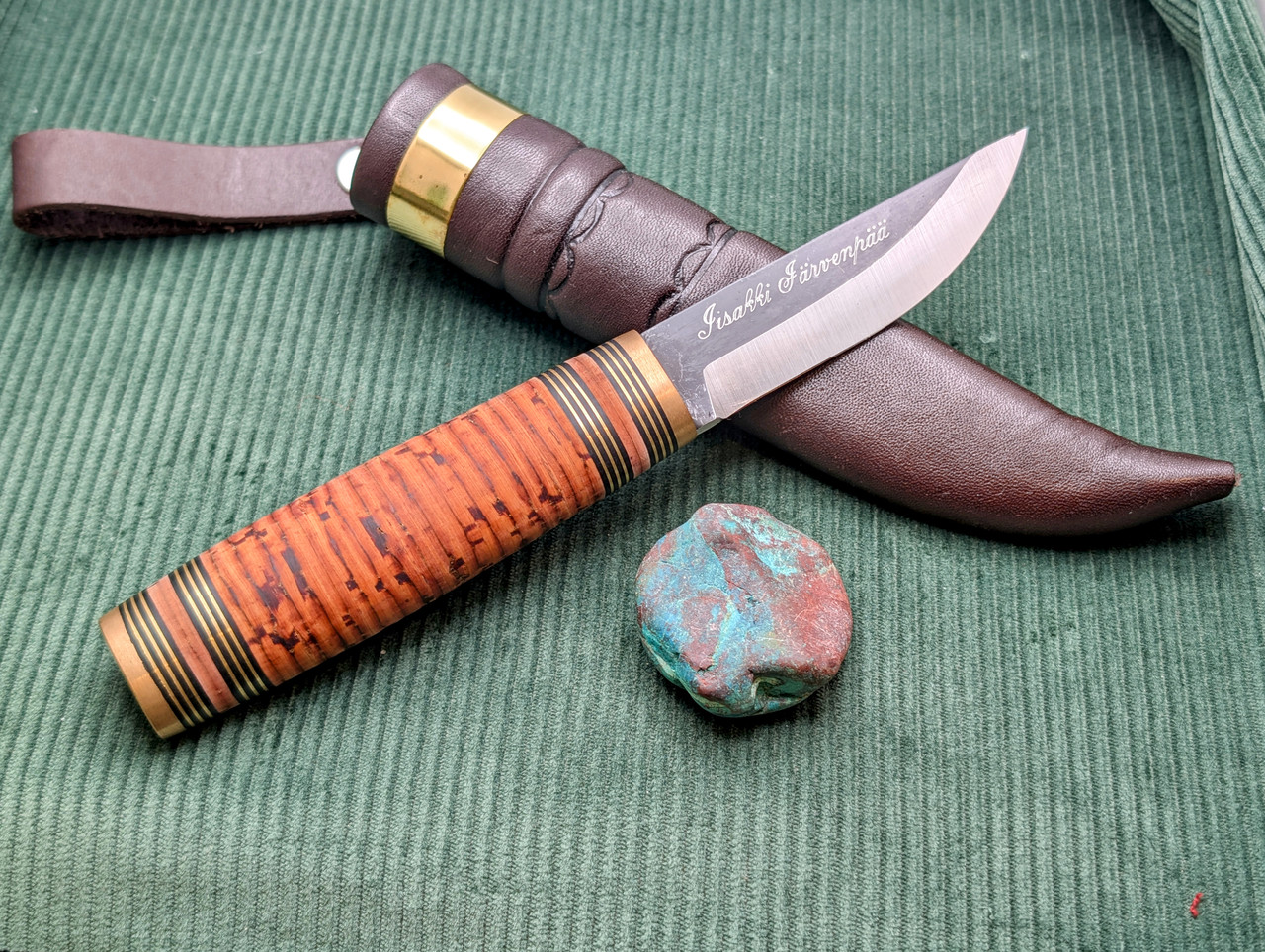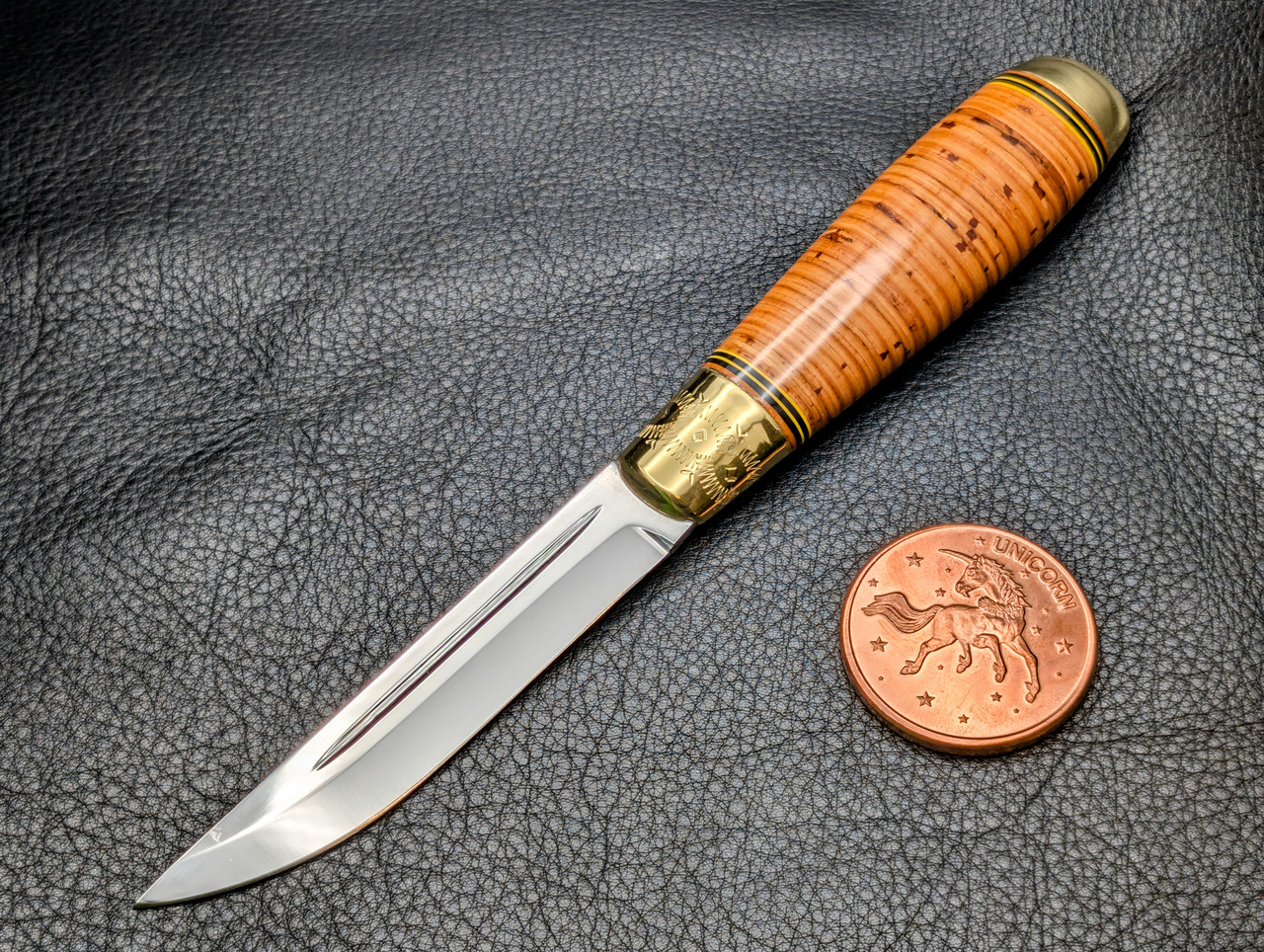 Would you please show the Back Side of the Sheath ??? I kind of like the Brass Ring on your's .Old Engineer Harry, that is a mighty fine puukko sir! I really wanted the same one you have but I was impatient and this one was available. Stacked birch bark & bronze. Not disappointed at all - the birch bark feels amazing in hand!