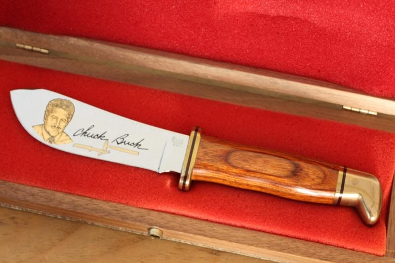 Buck 110 with gold etched rear paddle wheeler steam boat c.1990. This knife is documented on the 1991 Special Projects list. Serial number engraved to 1,000, the list records 550 actual production. This is a nice package with an Oak box and a faux marble lid with matching etch. There were 8 knives in this series with the marble lids from 1989 to 1991. The other etched images were Ducks. Geese, Pheasants Turkeys, Deer, steam locomotive. and Ghost Rider. The last gold etch knife Aurum made for Buck was the Chuck Buck 103 Skinner in 1989. Although Aurum discontinued etching services they did help Buck set up the same process so this knife would have been gold etched by Buck in house.