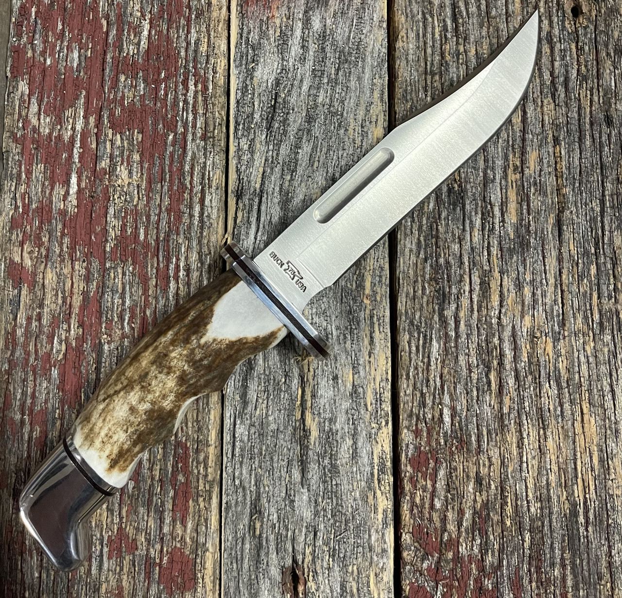 For the January 4th SPS my opening knife is the model 104 Standard Hunting Knife c.1947-1948. $8 in the 1948 catalog it sports a 5-1/2" by 1" blade. In the 1951 catalog it was called the Camper and inflation had pushed the price to $15 and a $16 Lignum Vitae handle option was offered. This knife is considered the predecessor to the modern day 119. The 1st knife in the 2017 75th Anniversary Historical Set is a copy of this knife. I don't know how much cleaning of the blade is acceptable on these early ones.