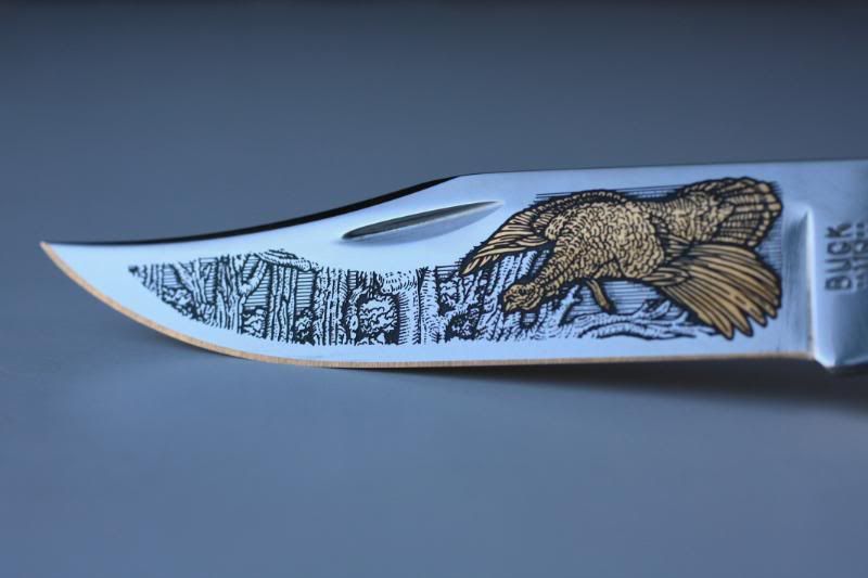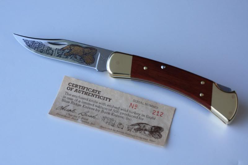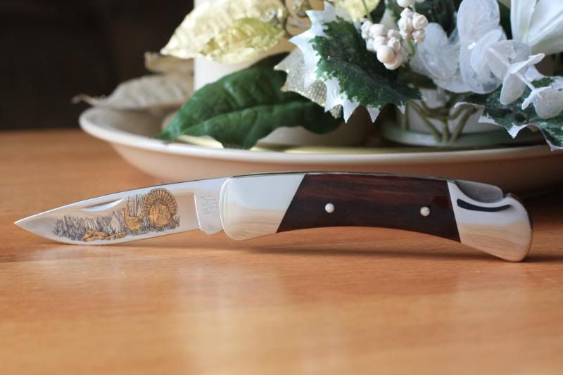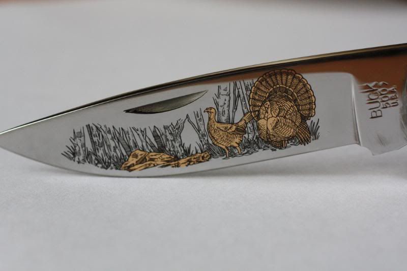 My contribution to this weeks "Turkey Theme" Sundy Picture Show. March 2020 BOTM 538 Open Season small game knife with a turkey feather laser etched onto a white micarta handle the blade is 12C27M with a satin finish, 1 of 200 produced. The pistol is a NWTF Bowning Buck Mark that I won at a fundraiser in 2006.
