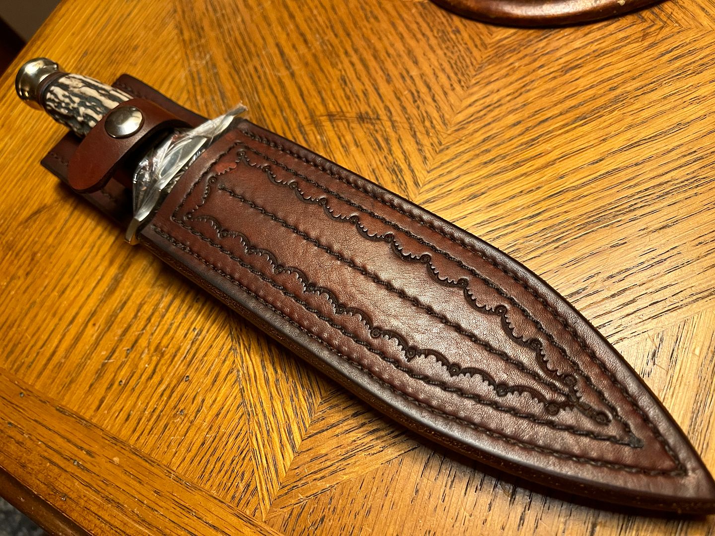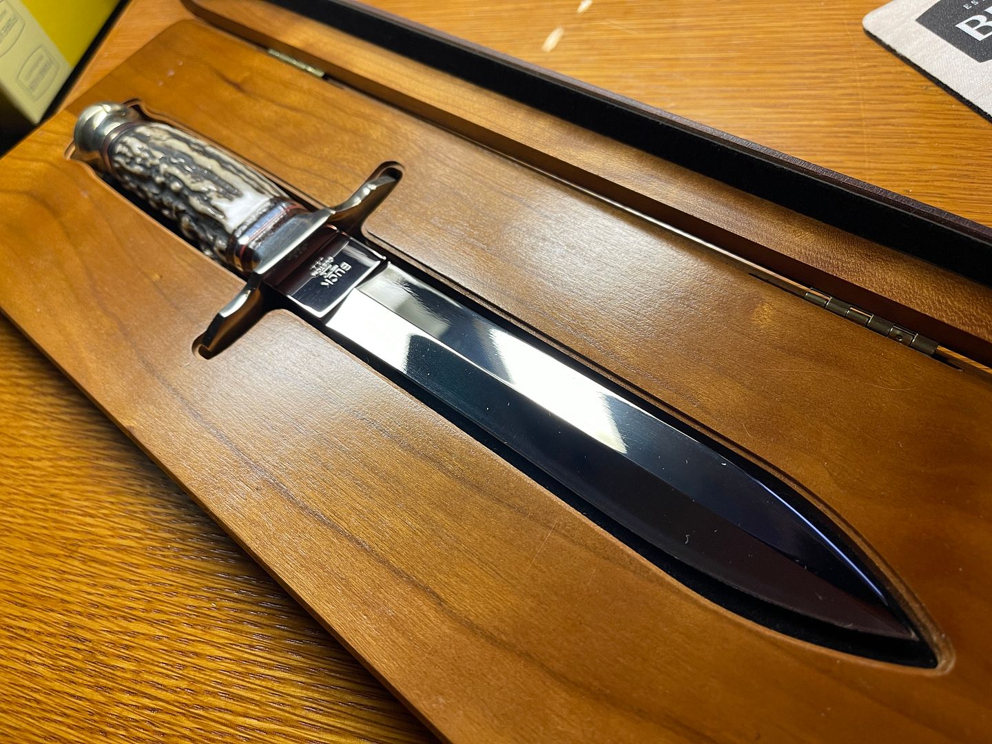 First up for me, an Elk handled 005 Gen-5 Majestic Elk skinner with laser etch art on the handle. 1 of 500 from the 2009 Legacy collection and is listed on the 2008 Special Projects List. 154-CM blade and a Nickel Silver guard. There is a companion 110 and 301 in the series.