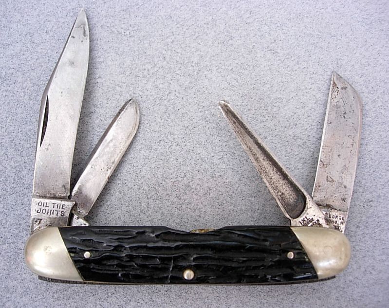 It probably had an etch for a retail concern. The bottom knife is a Schrade Walden.