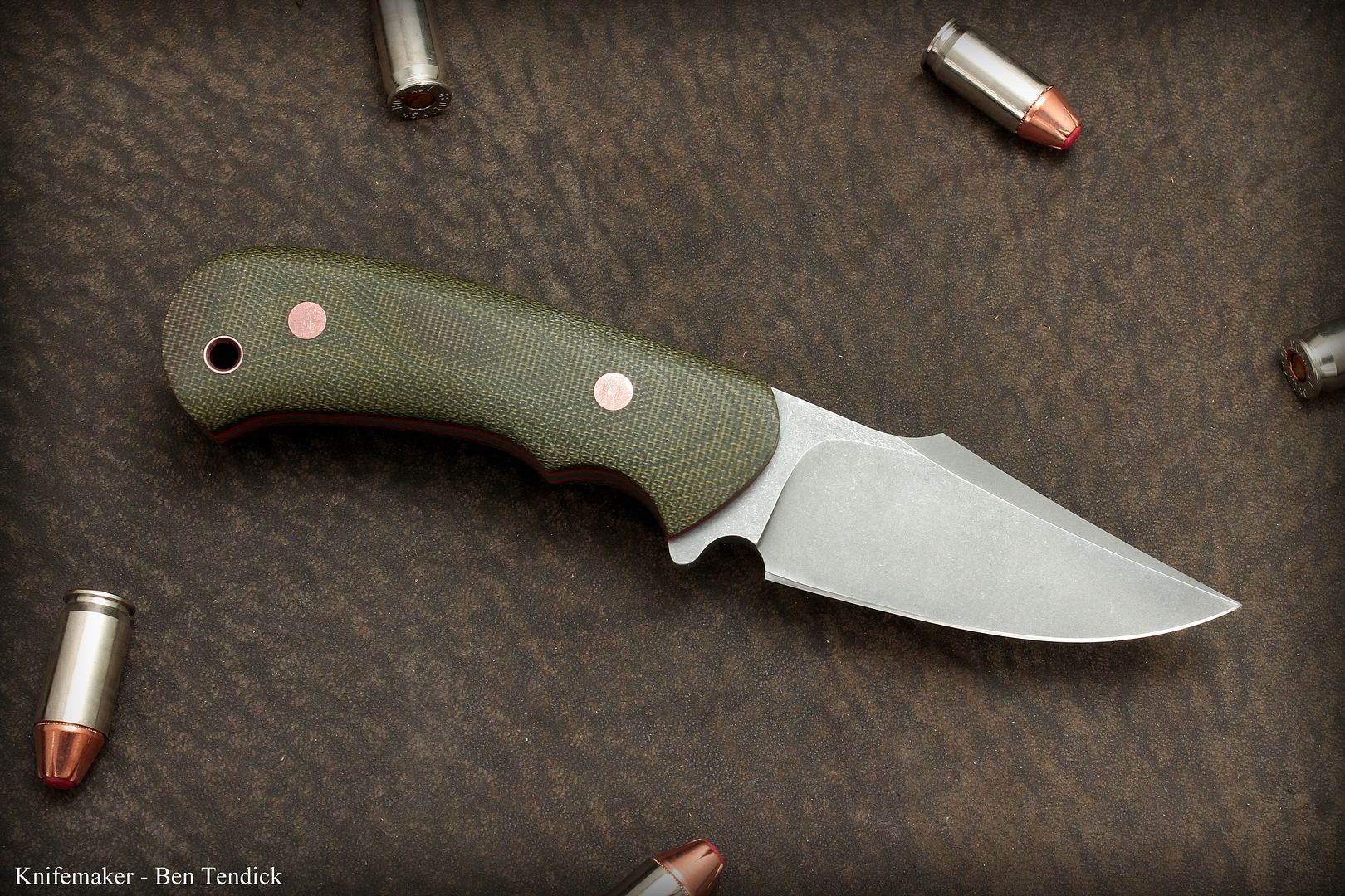 These first couple I did in CPM 3v at 62rc. I do my own heat treat on these, which includes proper LN Cryo and a low temp temper (thanks to Nathan Carothers and Dan Keffeler for HT pointers). I blasted the green micarta on this one and then tumbled the whole thing for an nice grippy feel. This also give the copper pins a cool look.