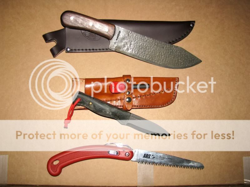 OK, I've been giving a lot of thought to a three tool array that is reasonably compact and competent enough to cover almost any contingency for general camping. I motorcycle camp a lot, so I'm able to deal with a little more weight than would be desirable for back packing or minimalist camping, but I like to keep the load down to three good tools for the bike, because space is still a factor. Of course when I take the wife and dogs along, and camp from the truck, I can load up all kinds of stuff because I have the room; hatchets, an axe, bow saw, numerous knives, flux capacitors, kitchen sink, etc.