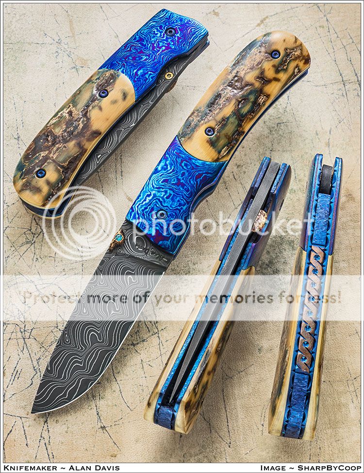 Timascus bolsters, mammoth bark scales, with a stainless damascus blade (Rob Thomas typhoon). The titanium back spacer has roman knot file work in between hand texturing, the thumb stud is hand carved with a blue diamond accent.