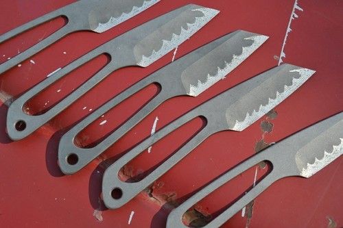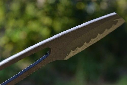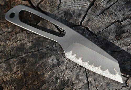 6al4v Titanium with 72 RC Tungsten Carbide Edge - excels with abrasive materials such as cardboard, very aggressive with meat, vegetables, cloth, cord, softer materials, etc...