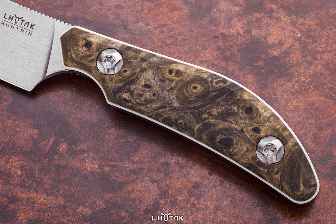 Finished with a hand satin and tumbled over. Handle is stab. Buck Eye Burl with G10 Liner and Ti Lanyard Pin and Ti Screws.