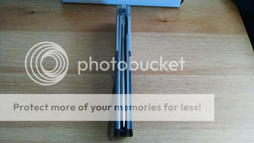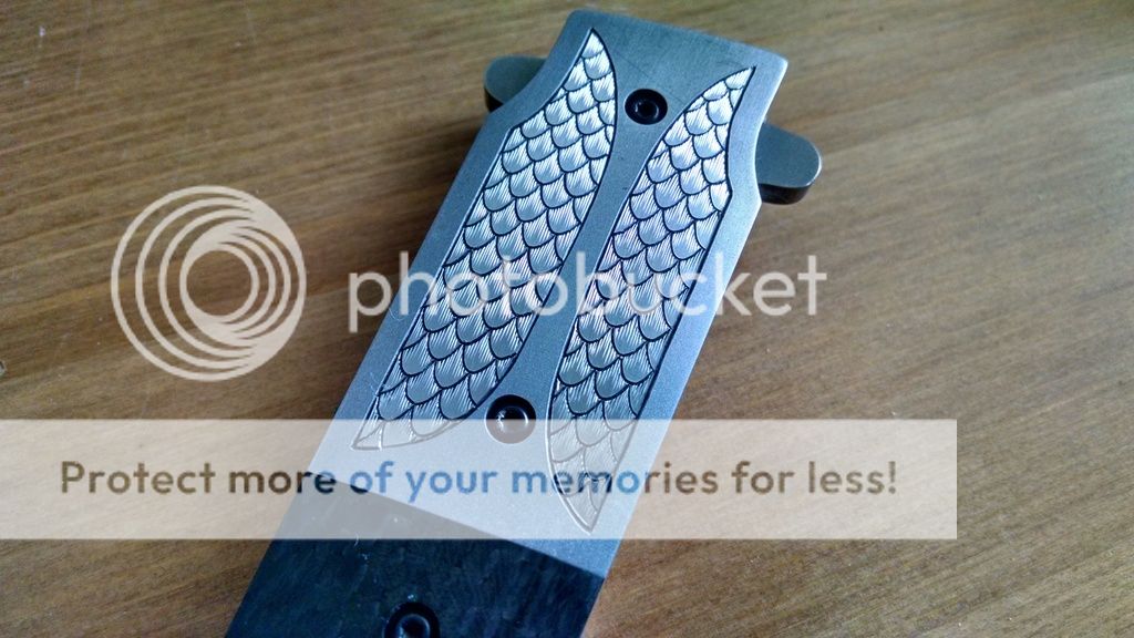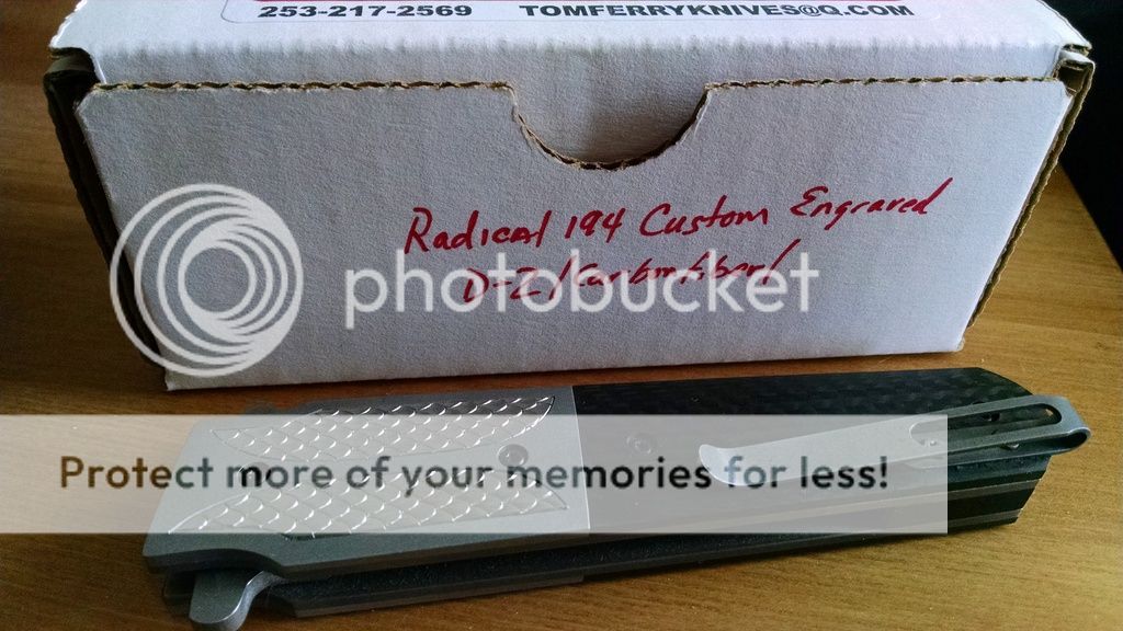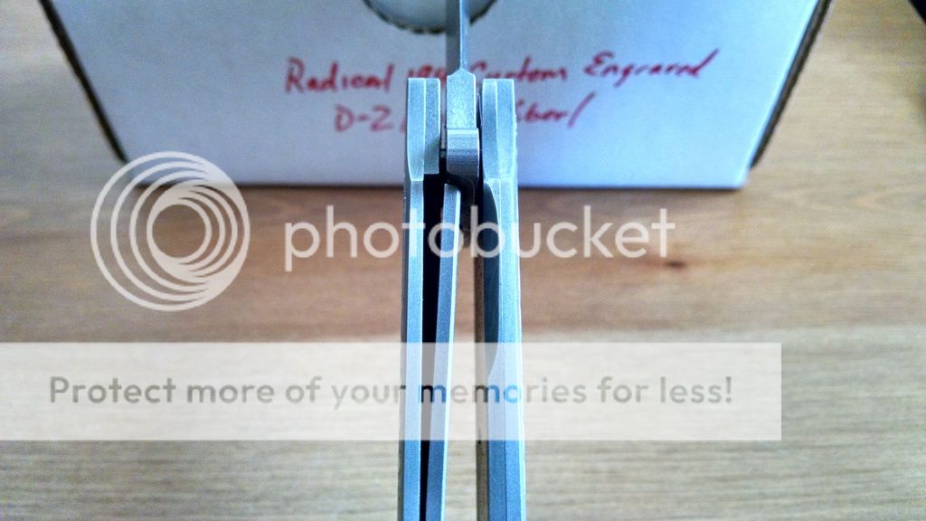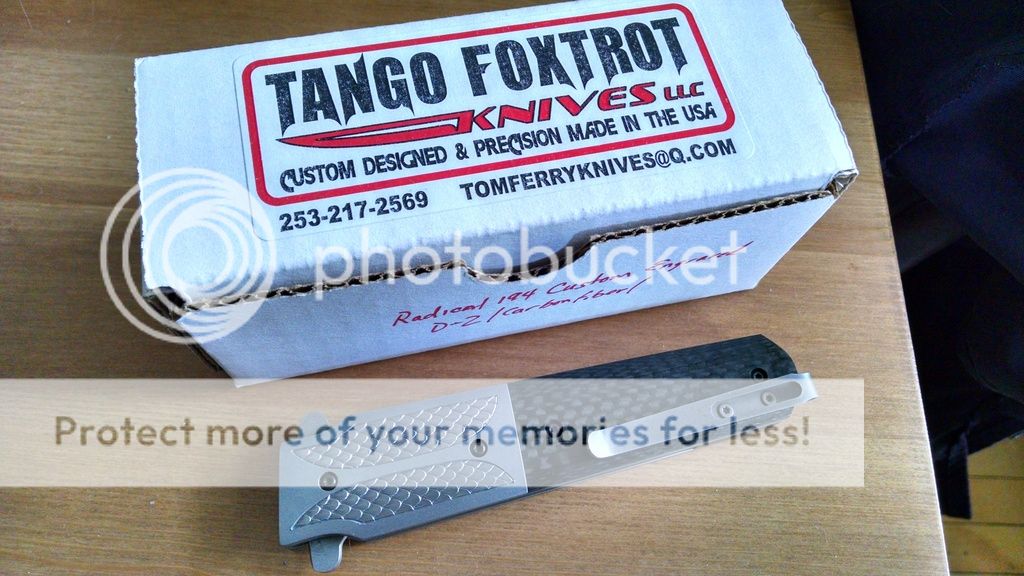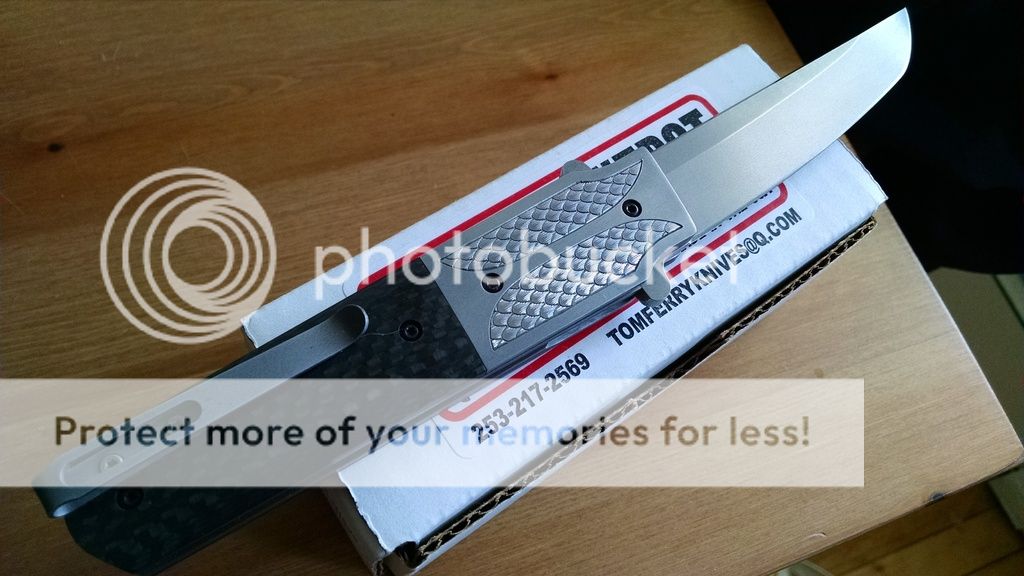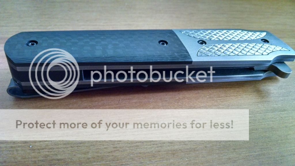 This one is done up in carbon fiber with a 4" bead blasted D2 blade. Titanium liner lock with solid lockup and zero play in any direction. Blade is perfectly centered, flipping action is fast and smooth oj Tom's atomik system with no wrist action required. Back spacer is carbon fiber. also note the nicely peaked spine on the blade, great touch. Lock releases smoothly as well.
