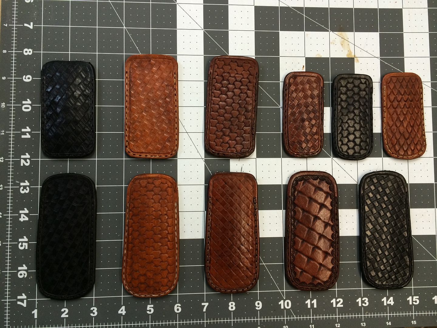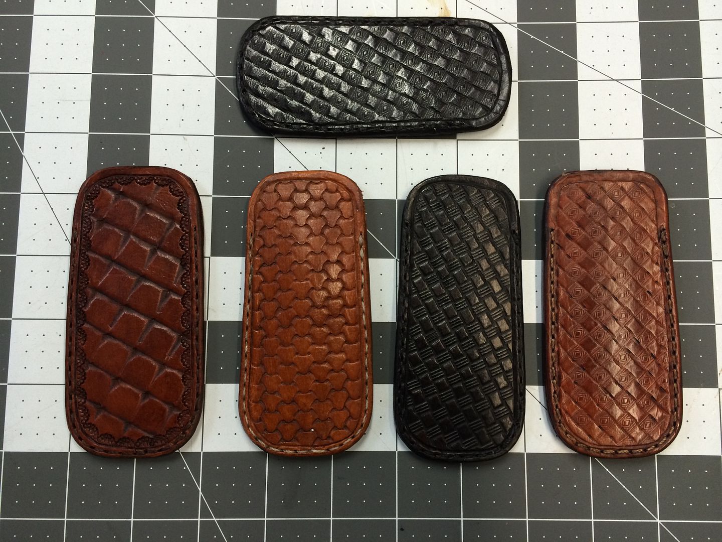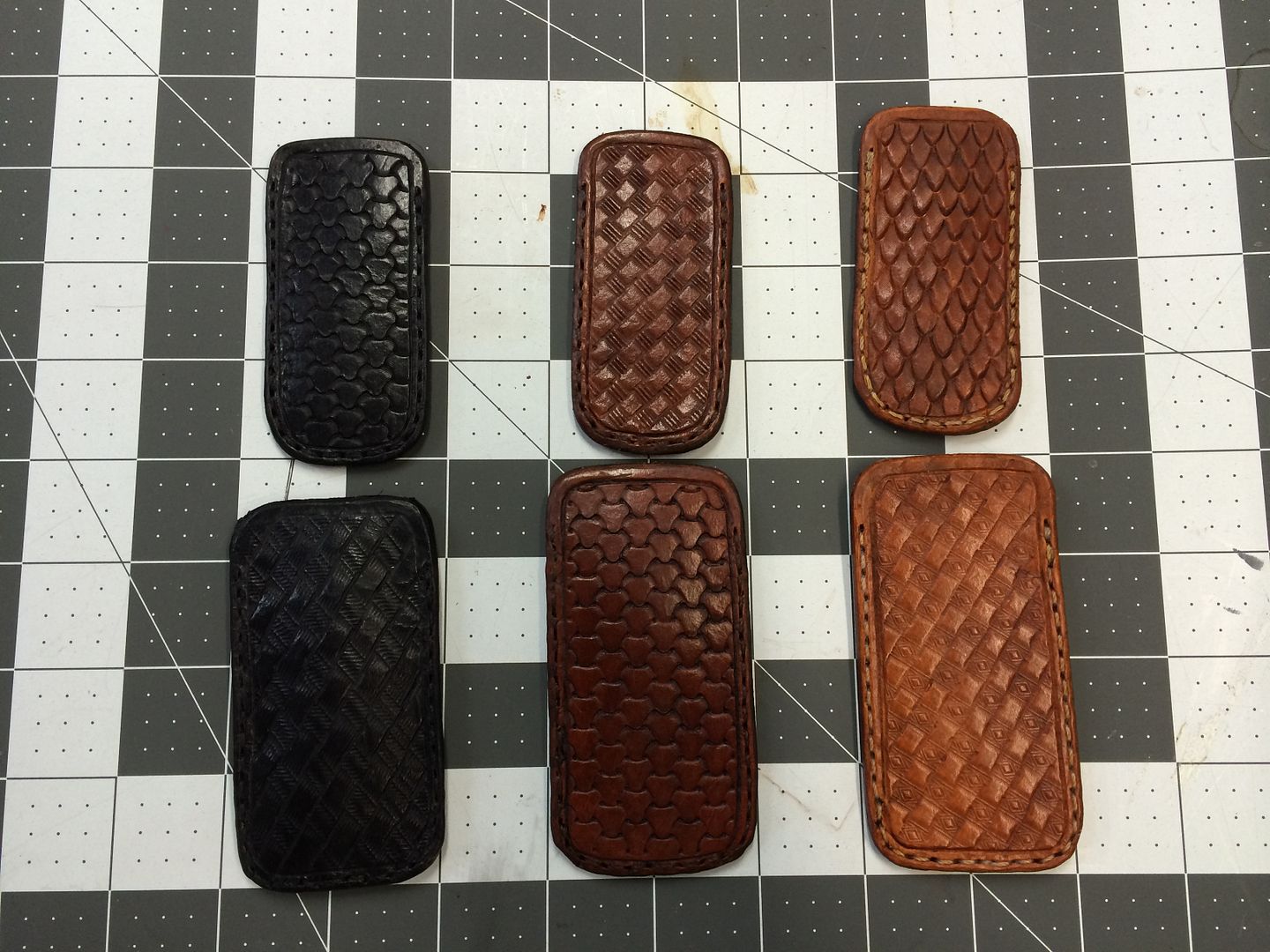 Here are some leather pocket slips for sale. They are hand tooled, dyed, and stitched.