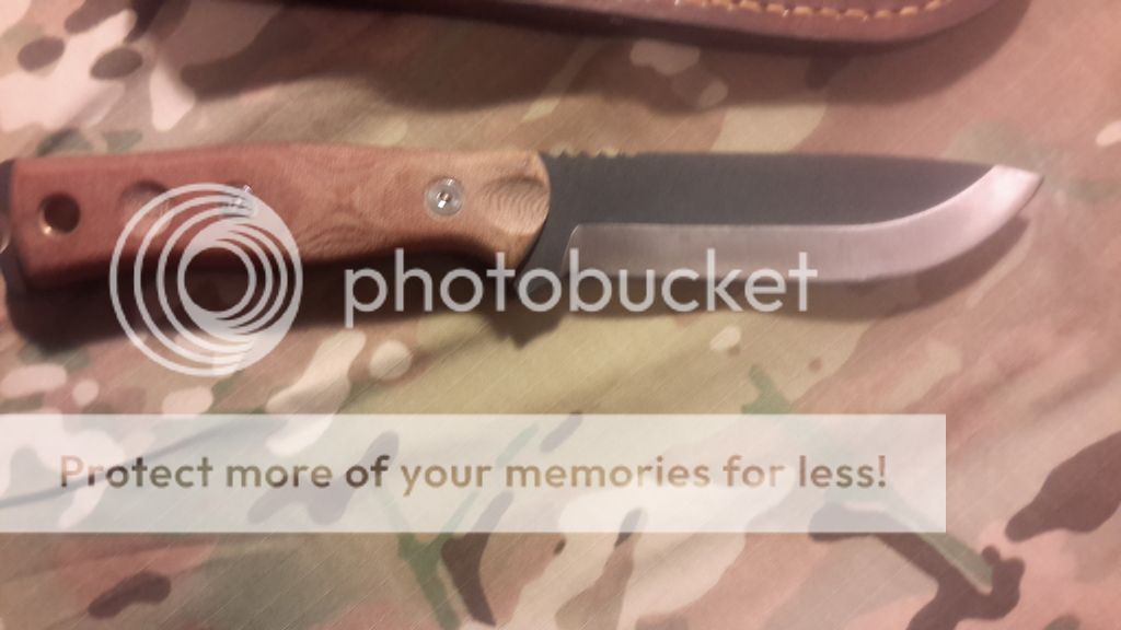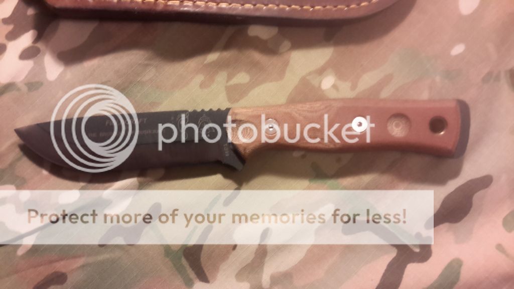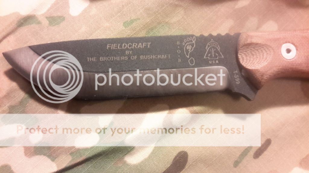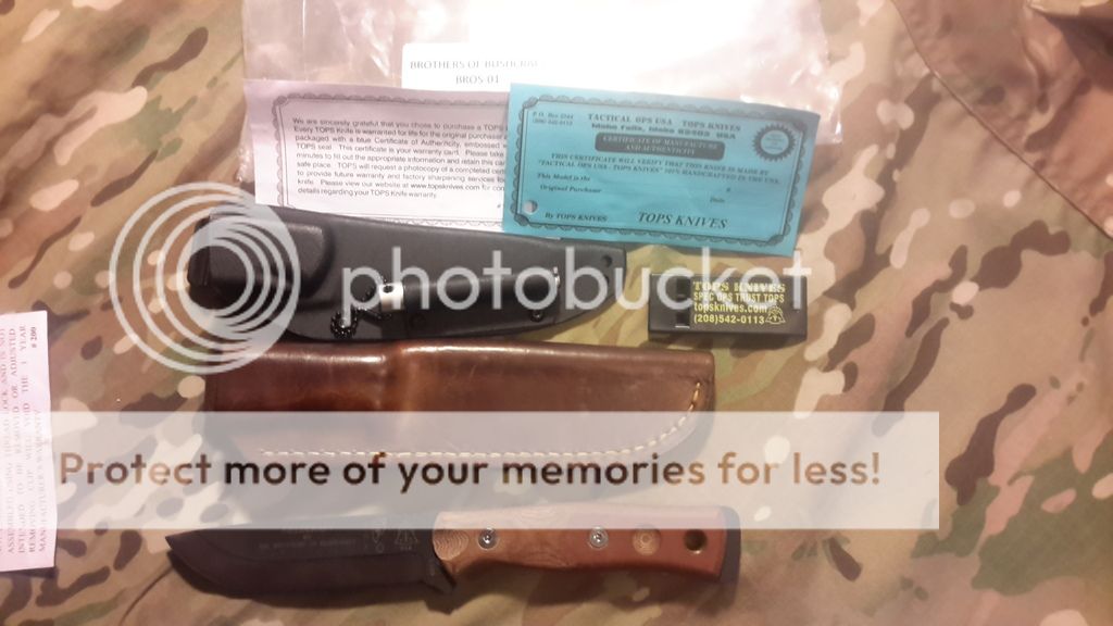 Good afternoon , I have here for sale a Tops Brothers of Bushcraft. This was received in a trade.It comes with a very nice custom Leather sheathe and the original Kydex with firestarter and a whistle. I just prefer my Esee 6. Looks like there is a couple black spots on the satin finish of the blade. I will try and polish them out before shipping. I have attemped to use the firesteel once to light a campfire so its slightly used. The previous owner also said he used it.