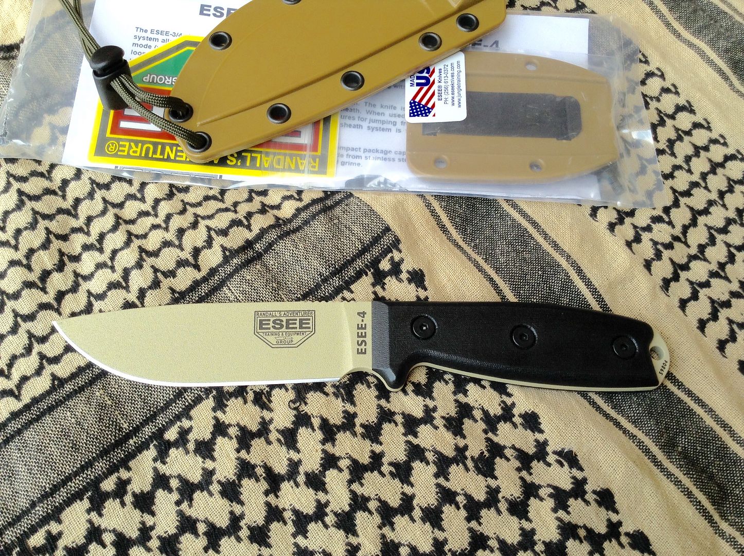 First is a new ESEE 4 in tan with black dyed and sealed Micarta handles. Includes the factory coyote sheath with the plate clip and paperwork. --SOLD--