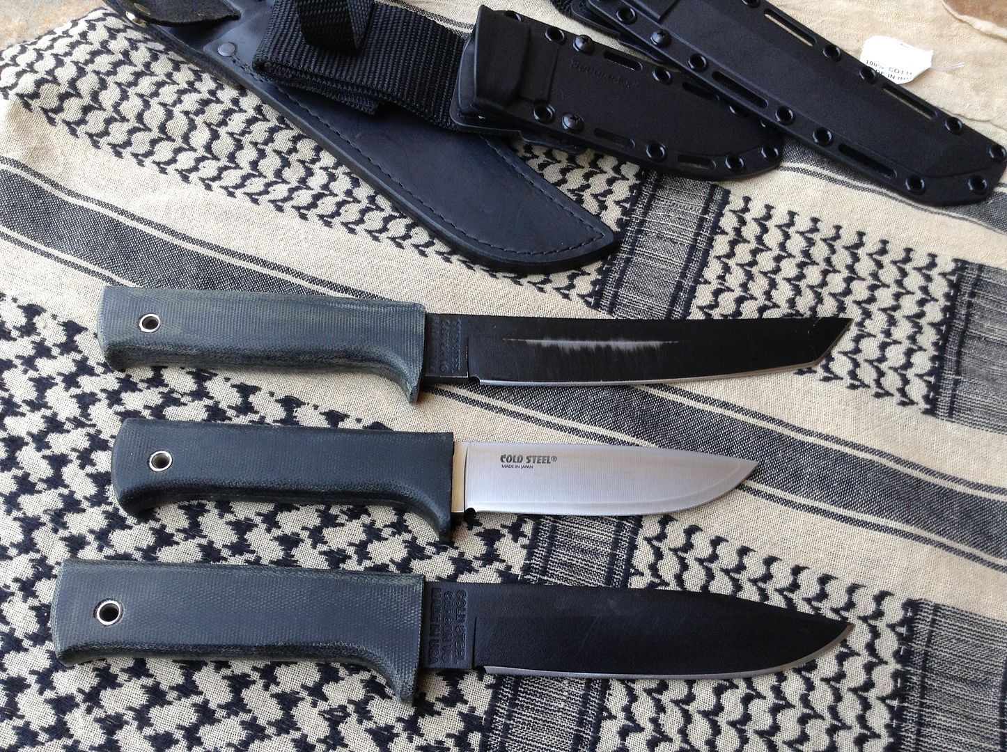 Next I have a Cold Steel Recon Tanto and an SRK in Carbon V, as well as a SanMai III Master Hunter with black canvas Micarta handles. Edges are perfect on these. SRK has a none factory leather sheath that fits it and the other two have their factory secure-ex sheaths. These were all professionally rehandled by Justin Gingrich. Your choice, $85 each shipped.