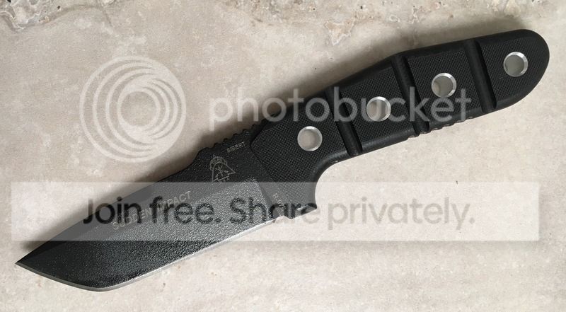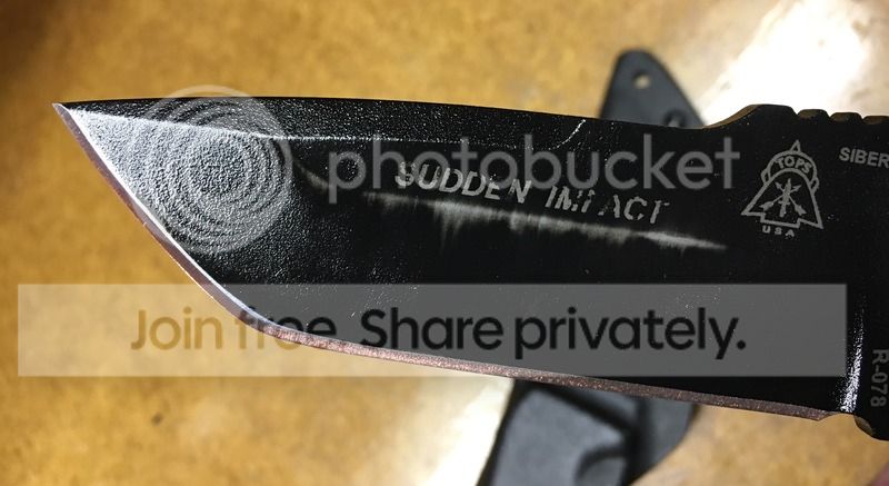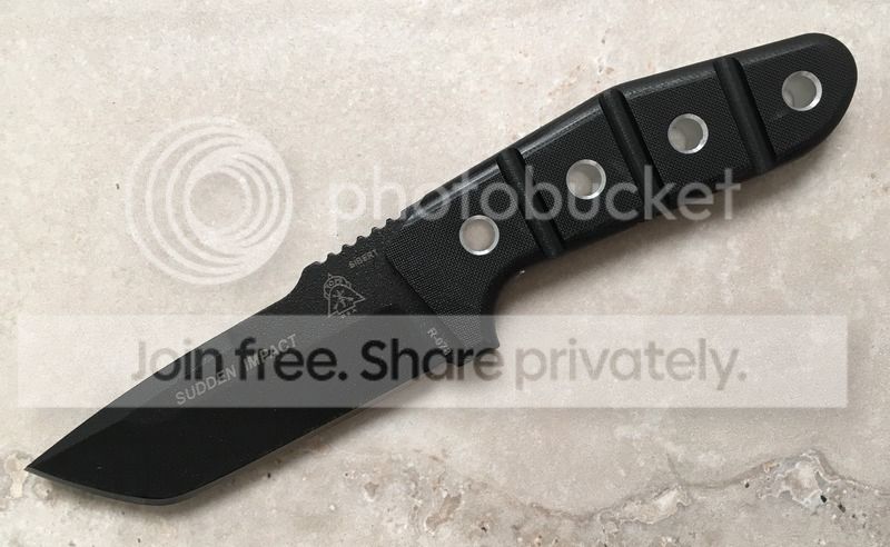 Ok, so I was looking for a specific type of knife recently. I wanted a lot of tip strength and stoutness in the blade. I didn't want an edge really over 4" with a balanced over look to the knife. I noticed that in my searches this lead me more towards an American-ized tanto style blade. However, I'm not a huge fan of the extreme squareness of that style tip. I wanted it slightly rounded. In my Google image searches I came across a knife designer named Shane Sibert. He had the exact style I was looking for but his website says he really isn't taking orders currently and the price (although I'm sure is worth it) was higher than I could give up right now. When I searched his knives I found that he did a knife for Tops in the past called the Sudden Impact. It was perfect for what I was looking for so I was stoked. I was bummed when I found out it was discontinued, but then Ebay came to the rescue and I found one BNIB for $135 shipped. WOOT! Needless to say, I got it in and it feels great in hand. I look forward to getting it used and looking less like a new blade.