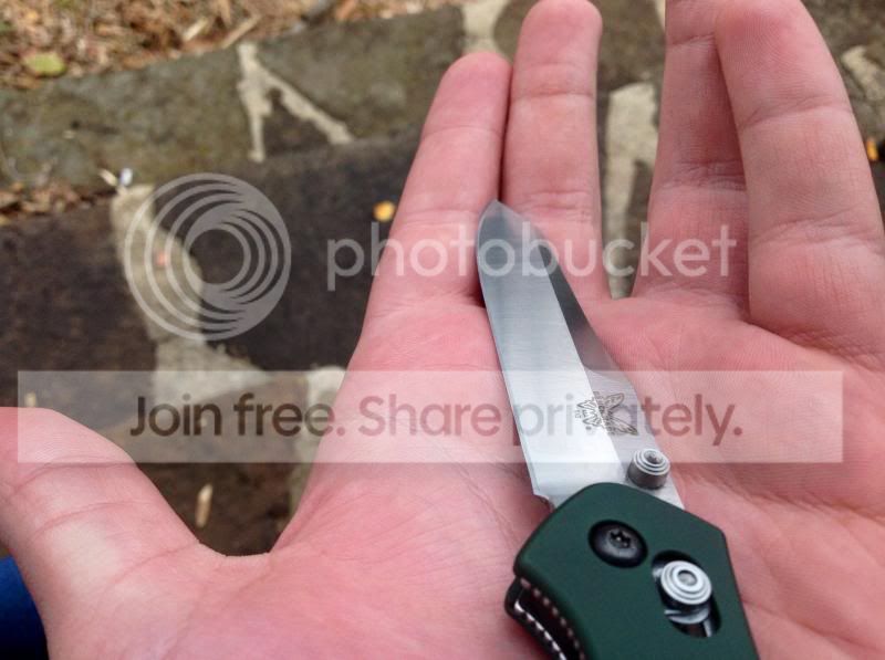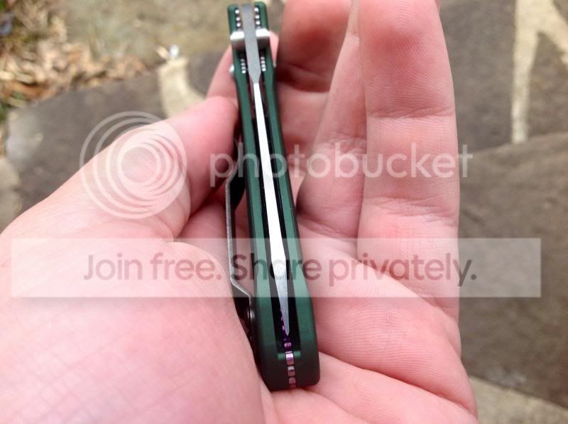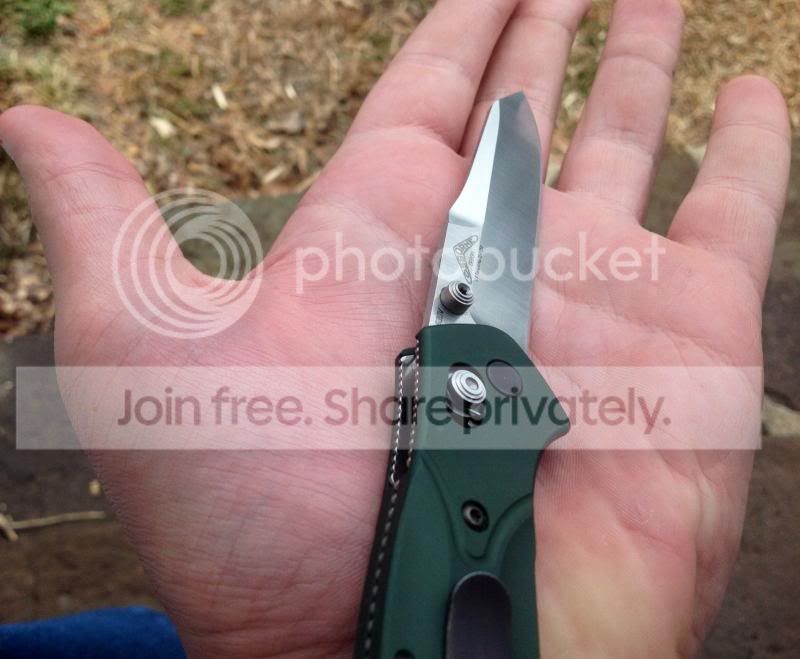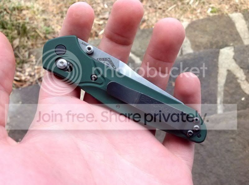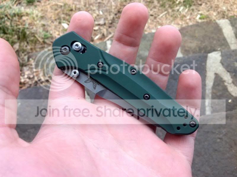 Hello all! today I've got a user benchmade 940 Osborne for trade, it has been free hand sharpened on a fine spyderco benchstone and is reasonably sharp, won't quite shave. the anodizing on the handles has a few minor scuffs, and I switched the standard black painted clip for a Parkerized one. I tried to remove the purple anodizing from the back spacer, so now it has purple valleys and silver peaks. The blade doesn't have any major scratches. It was disassembled immediately upon receiving to wipe off the factory oil, polish the washers, and apply nano oil, it was cleaned again a couple days ago to get rid of any dirt had accumulated from the few times I carried it. Comes with box, baggy, paperwork, etc. email me at makerdude1 AT hotmail DOT com (replace the AT with @ and the DOT with . ) with questions.