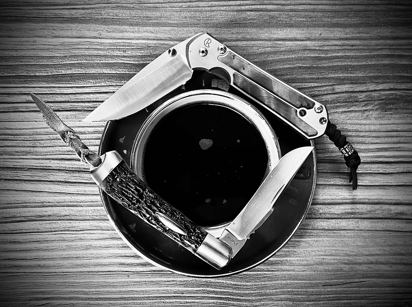 At 13:00 ("1:00 P.M.") I changed to the Imperial Frontier Double Eagle stockman and my TC 141122 'Tom's Choice' (blade etch wore off) Barlow on the traditional side.