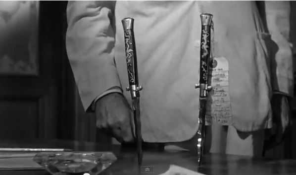 About the knife (knives). I've searched extensively on this. The consensus of both knowledgeable and ordinary people is that the knives were bought and then painted with the unusual dragon graphics by the movie prop department. As a semi-collector's item, I've considered buying one of the basic auto-stiletto, kriss blade type and getting an artist to mimic the dragon graphic. Unfortunately, the only pictures I can find or grab from the movie show the same side of both knives, so I have to assume both sides were painted the same. Here's a pic.