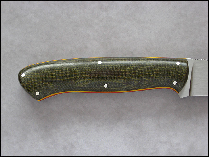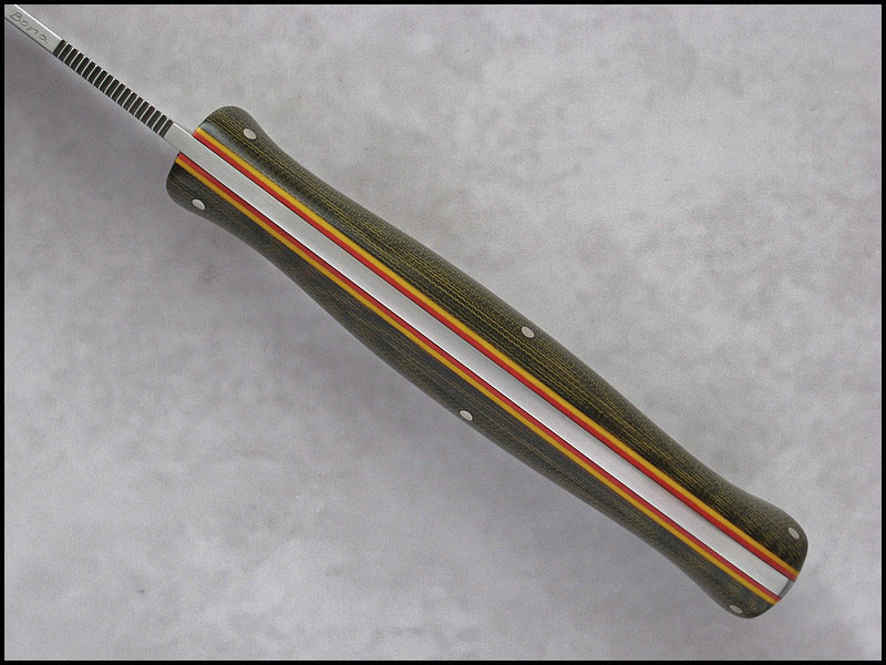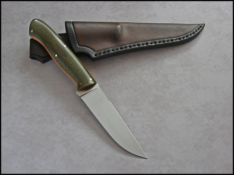 Bona The Art of Harmony Feedback: +31 / =0 / -0 Joined Apr 27, 2006 Messages 1,158 Sep 16, 2014 #1 Another Traveler for sale. steel - N690 / 3.2 mm [0.126"] length - 230 mm [9.055"] blade - 107 mm [4.212"] handle - olive canvas, yellow fiber, red fiber, nickel silver sheath - leather Price - $279 plus $11 for International Priority Mail plus 4% PP SOLD Last edited: Sep 17, 2014