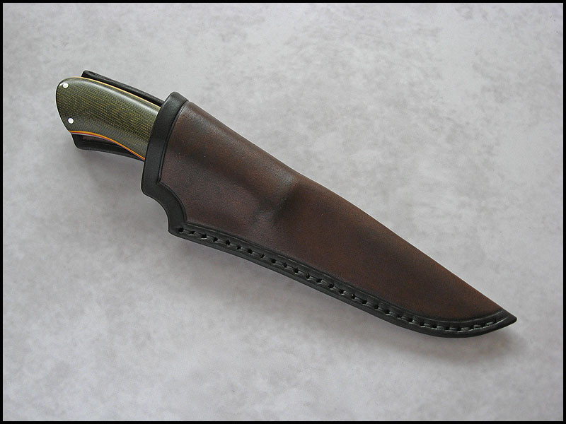 Another Traveler for sale. steel - N690 / 3.2 mm [0.126"] length - 230 mm [9.055"] blade - 107 mm [4.212"] handle - olive canvas, yellow fiber, red fiber, nickel silver sheath - leather Price - $279 plus $11 for International Priority Mail plus 4% PP SOLD