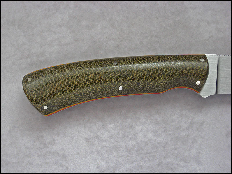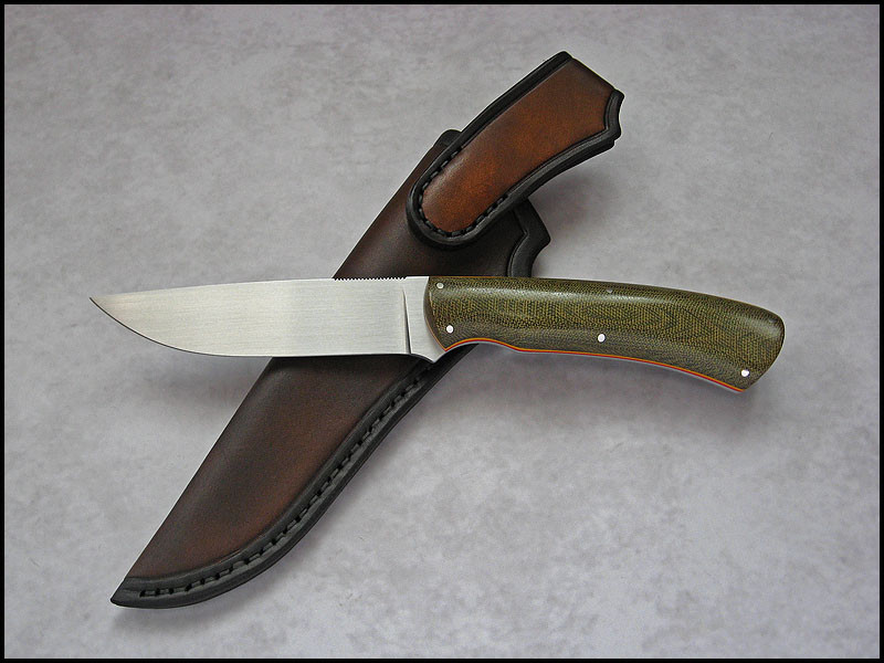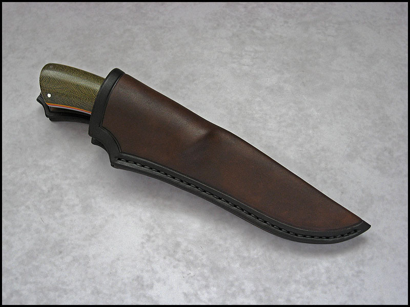 Another Traveler for sale. steel - N690 / 3.5 mm [0.138"] length - 245 mm [9.646"] blade - 117 mm [4.606"] handle - olive canvas, yellow linen, red fiber, nickel silver sheath - leather Price - $240 SOLD Included International Priority Mail
