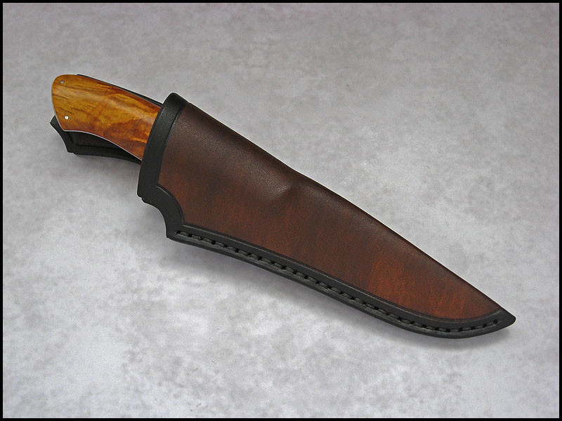 Another Traveler for sale. steel - N690 / 3.1 mm [0.122"] length - 231 mm [9.094"] blade - 110 mm [4.331"] handle - dyed and stabilized Box Elder, red linen, nickel silver sheath - leather Price - $250 plus $11 for International Priority Mail SOLD