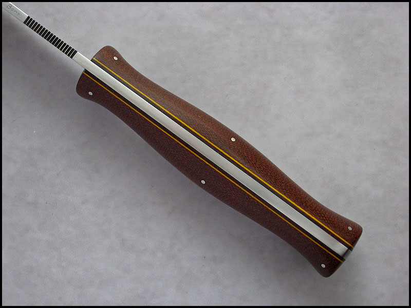 Bona The Art of Harmony Feedback: +31 / =0 / -0 Joined Apr 27, 2006 Messages 1,158 Jun 3, 2015 #1 Next Traveler for sale. steel - N690 / 3.5 mm [0.138"] length - 241 mm [9.488"] blade - 121 mm [4.764"] handle - brown canvas, yellow fiber, cocobolo veneer, nickel silver sheath - leather Price - $220 SOLD Included International Priority Mail Last edited: Jul 7, 2015