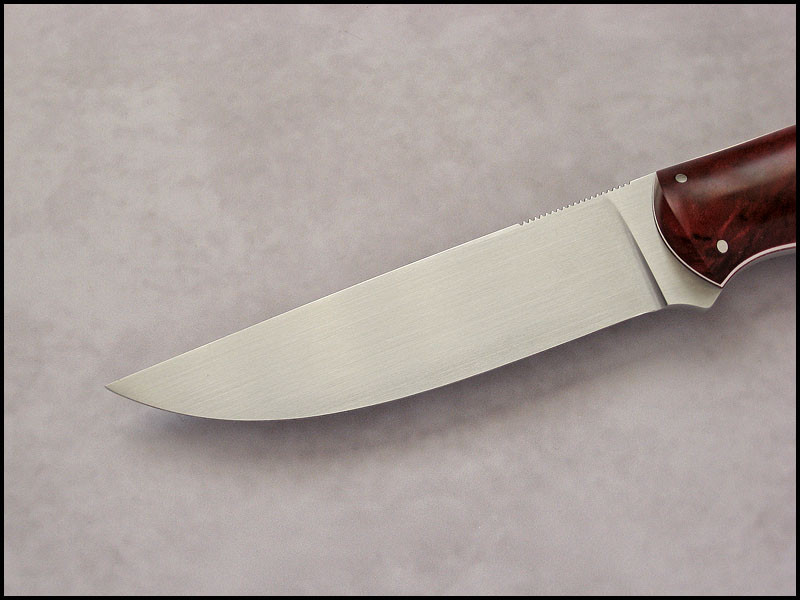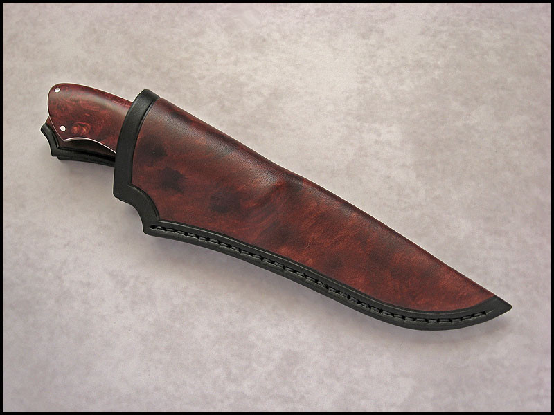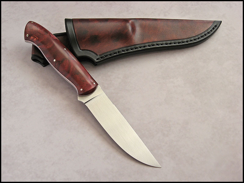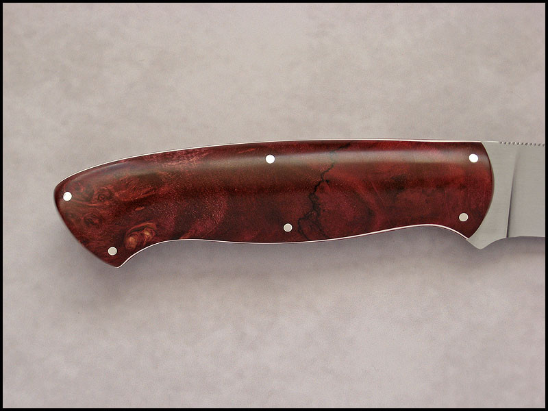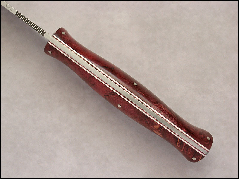 handle - dyed and stabilized Maple burl, white fiber, dyed Maple veneer, nickel silver