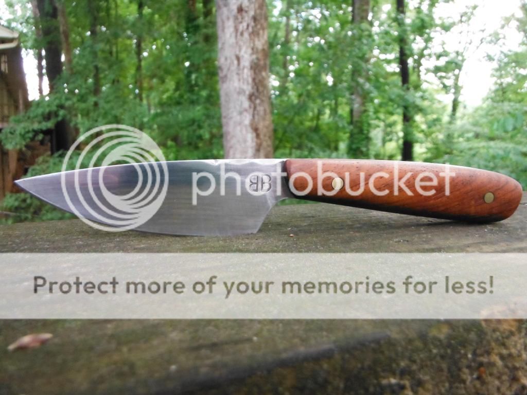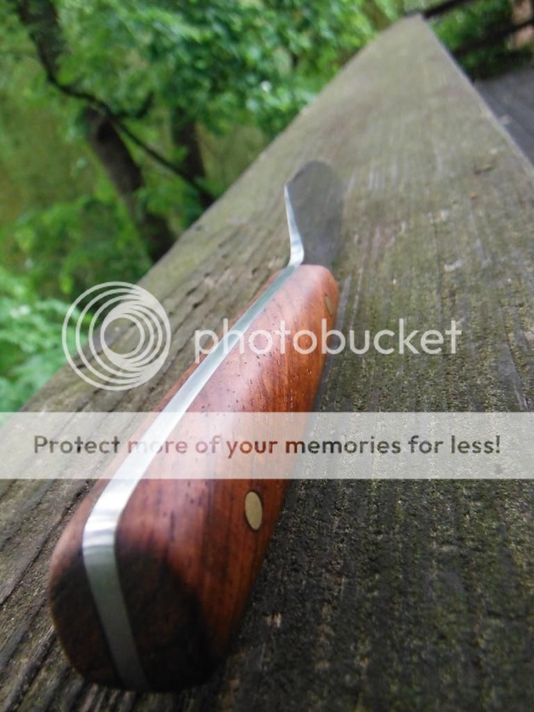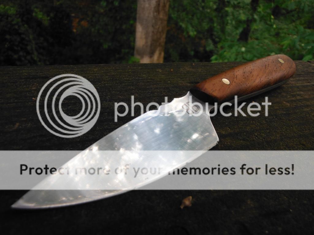 Hey all, I have just finished my first forged knife! This spring I went to the Georgia Knife makers Guild semiannual Hammer In. While there, my friends at Bloodroot Blades let me have some forge time to make my first knife! The blade is 5160 leaf spring that I hammered down to about 1/4". Sadly I couldnt stay all weekend so I was only able to get the shape and basic profile where I wanted it. Graciously my friends said they would take the knife back to their shop to grind the blade, heat treat and initially sharpen it for me.