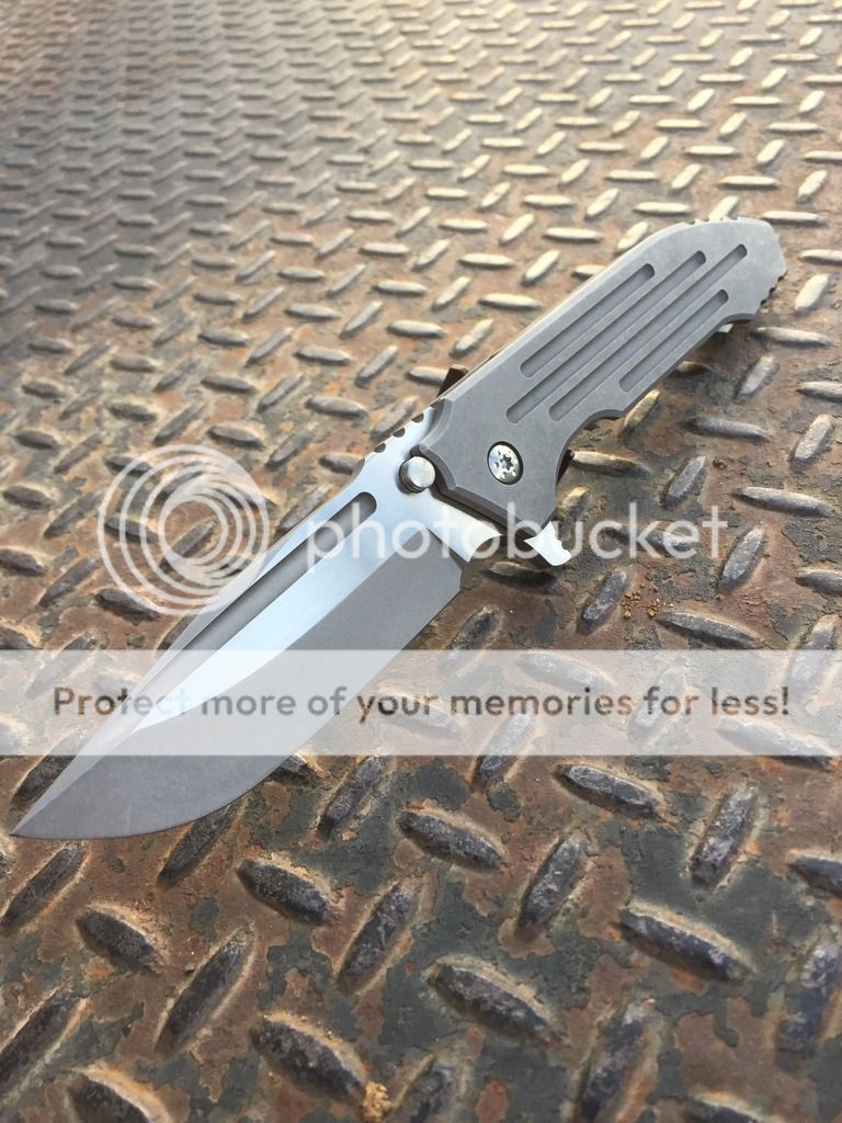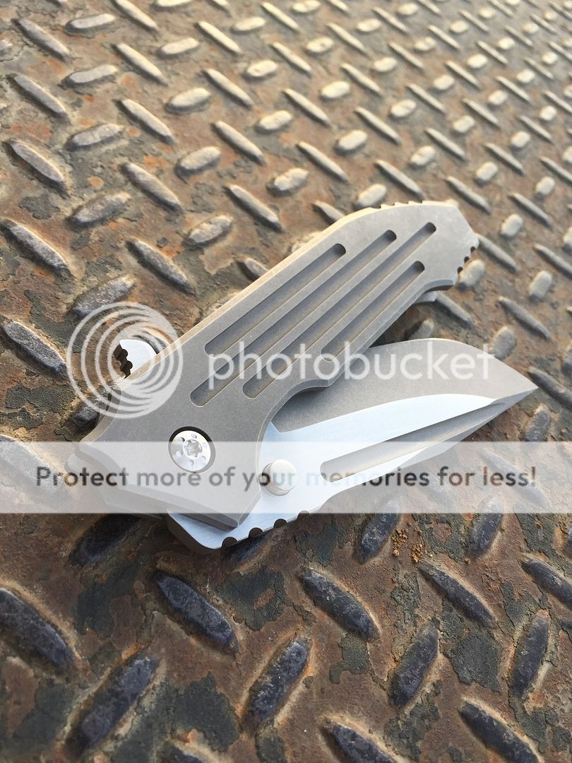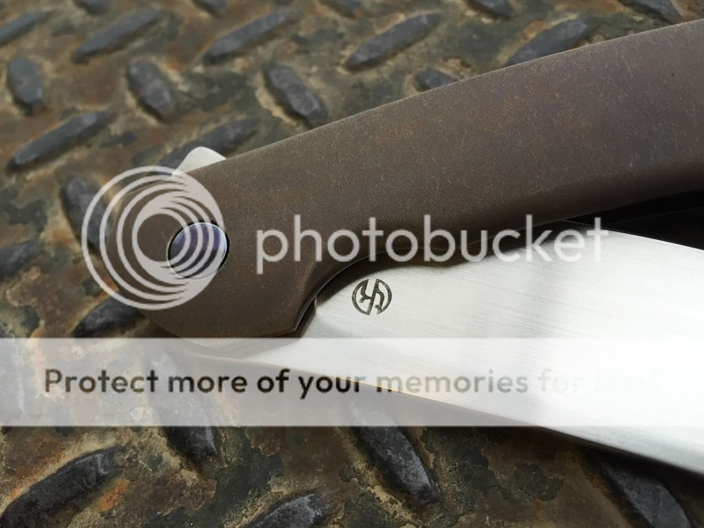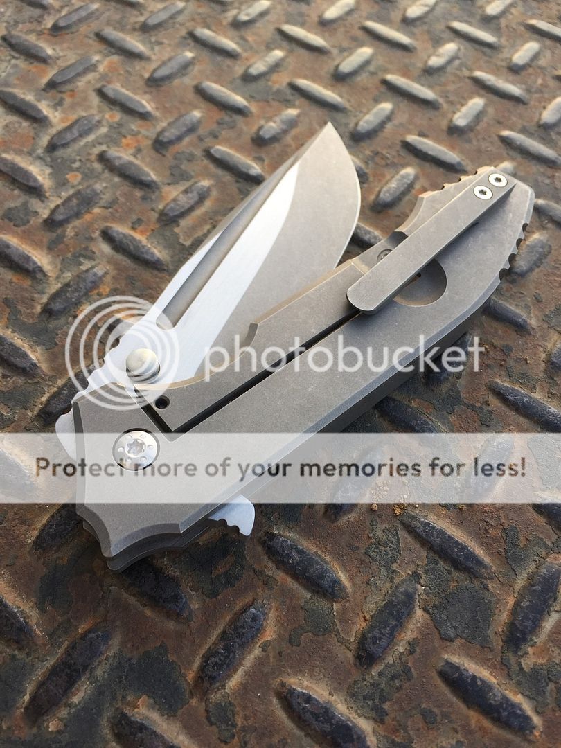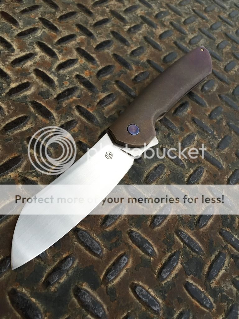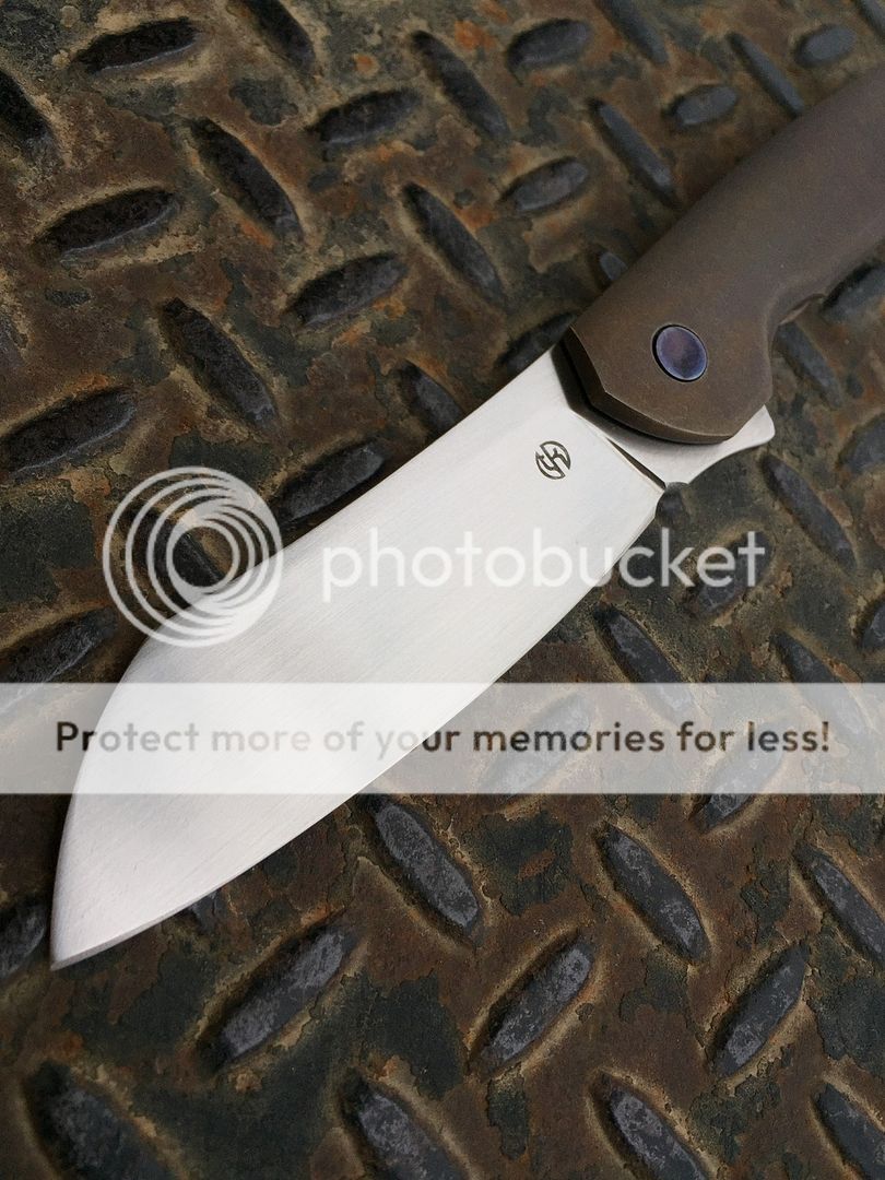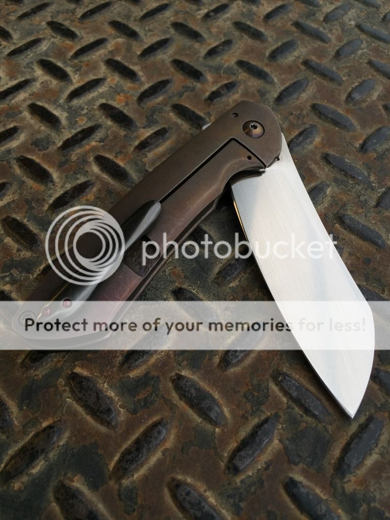 1. Tuff Knives Variant Gentlemen folder. Has a hand rubbed CTS-XHP blade, bronze anodized handles, blued pivot and barrel backspacer, and a zirconium clip with ruby inlays. There are very few of these out there, I only know of 4. Has minor lockstick but sharpie removes the stick. Also has very slight scratches on the tip of the blade, this was how I received it from a dealer who got it directly from Geoff, easily repaired if sent back to Geoff. Its has never been used to cut anything. $1,495