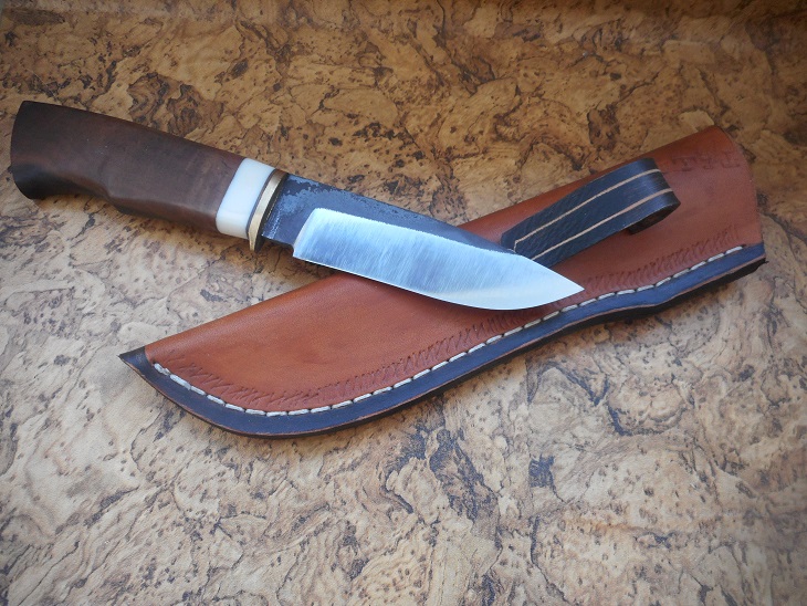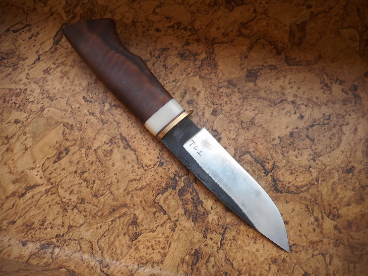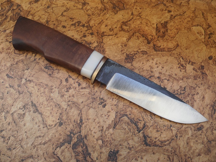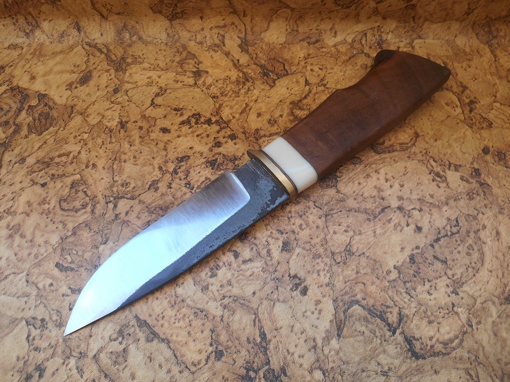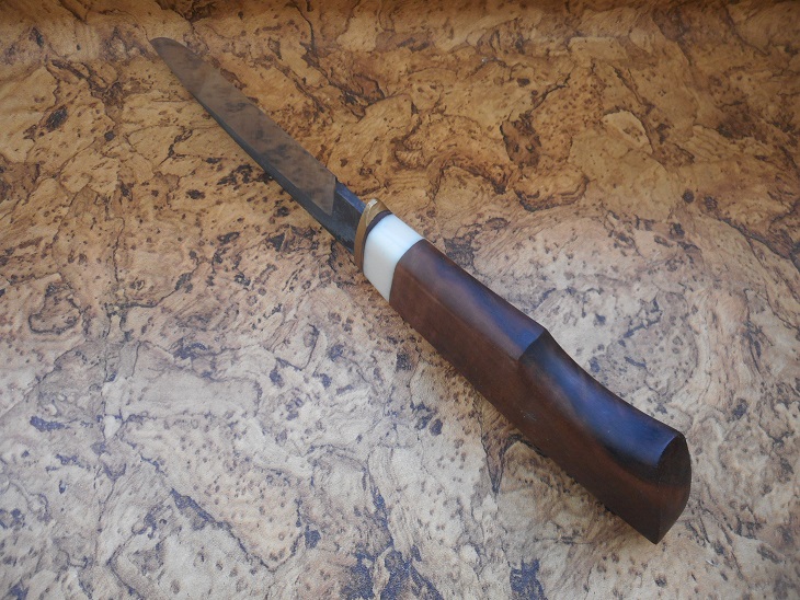 This is a knife I finished recently. The knife is really light and well balanced. The handle came out really beautiful. The pictures are made before I cleaned the brass guard from grinder dust and sharpened the knife.