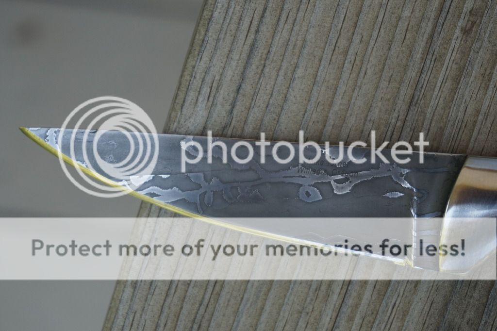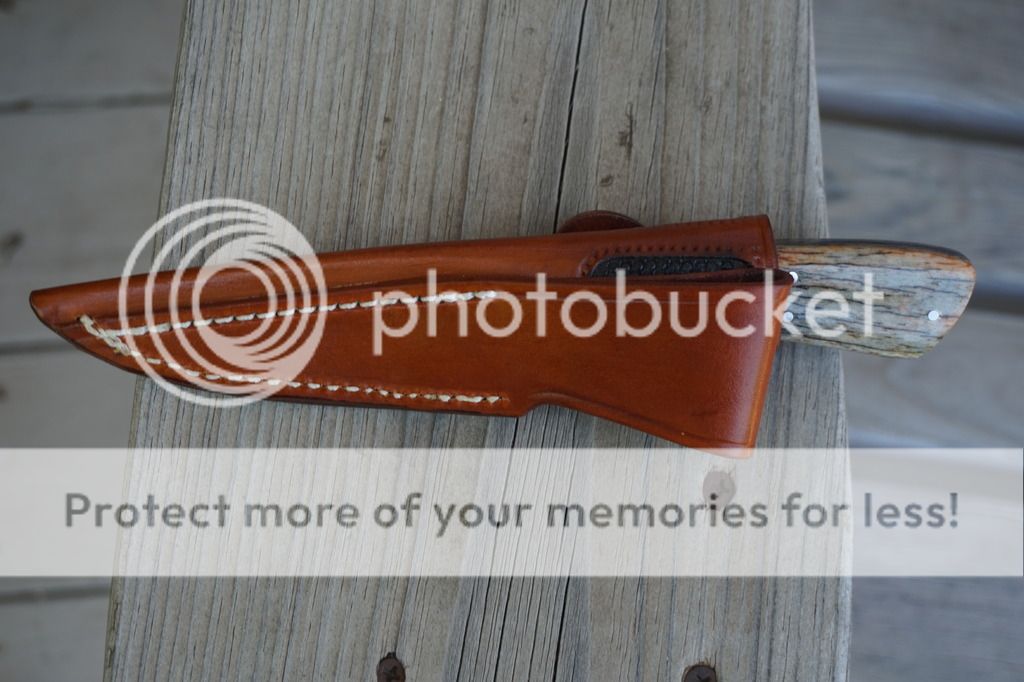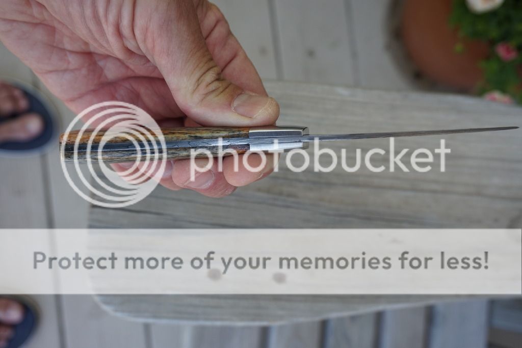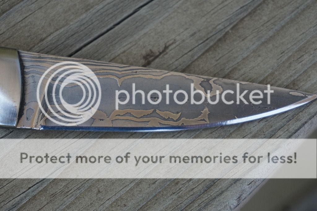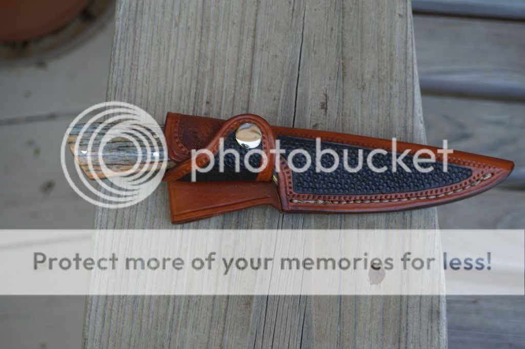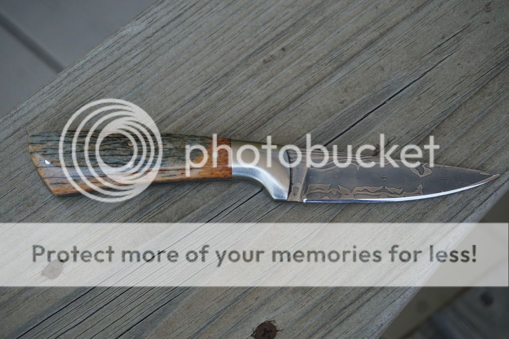For sale is a never used or carried Bird N Trout/EDC by Mike Turner. This is a beautiful random pattern Damascus forged of 1095, 1084 and 15N20. The scales are dyed and stabilized giraffe bone with stainless bolsters and pins. Blade length is 3.25" and is 1/8" with distal taper. Overall length is 7.5". Very nice custom right hand sheath by Martin (Sandy) Morrissey.