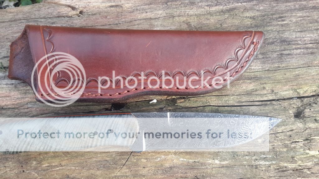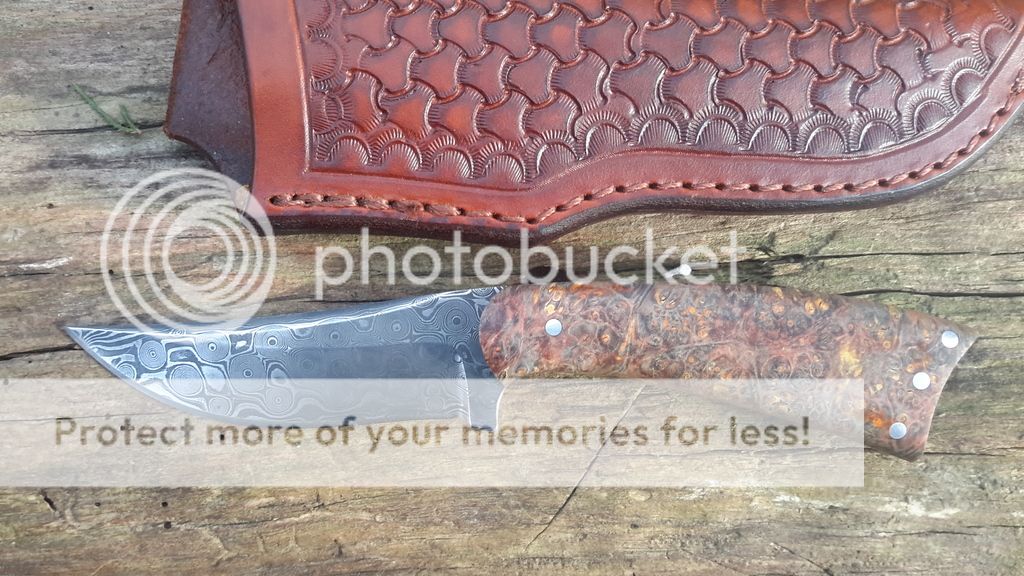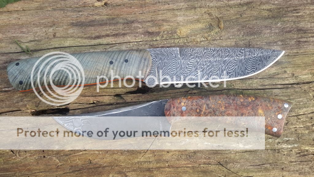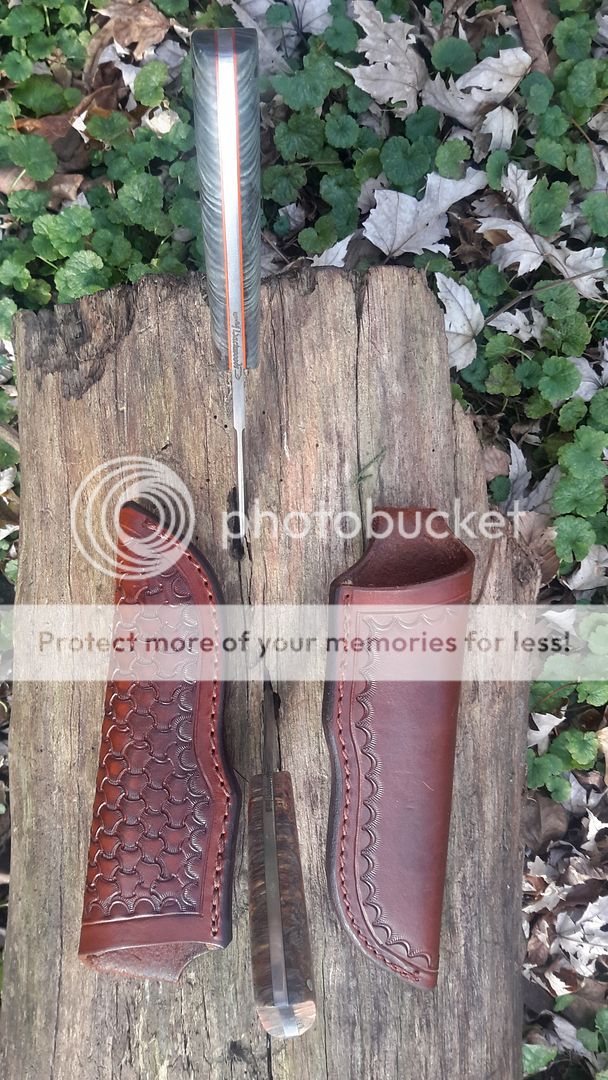 I have two knives for sale here. Both knives are in Elder Burl handles, and Damascus blades. The Persian style blade is about 3.2 inches long, the hunter is 4.1 inches. They both come with leather sheathes. The blade on the hunter protrudes very slightly at the tip when placed into its sheath. I've never used these knives just admired them. Some really nice work done here. I will post the original sales threads once I find them to give more information.