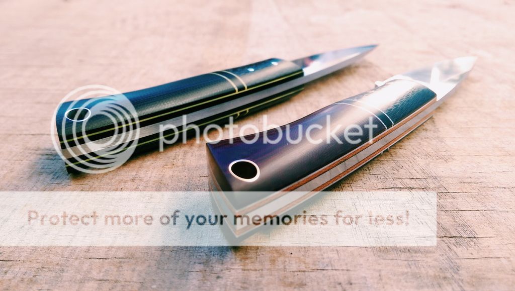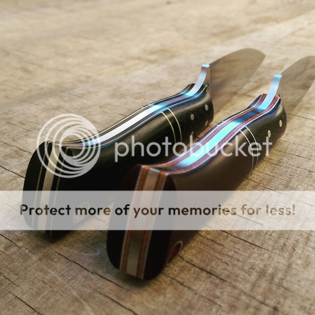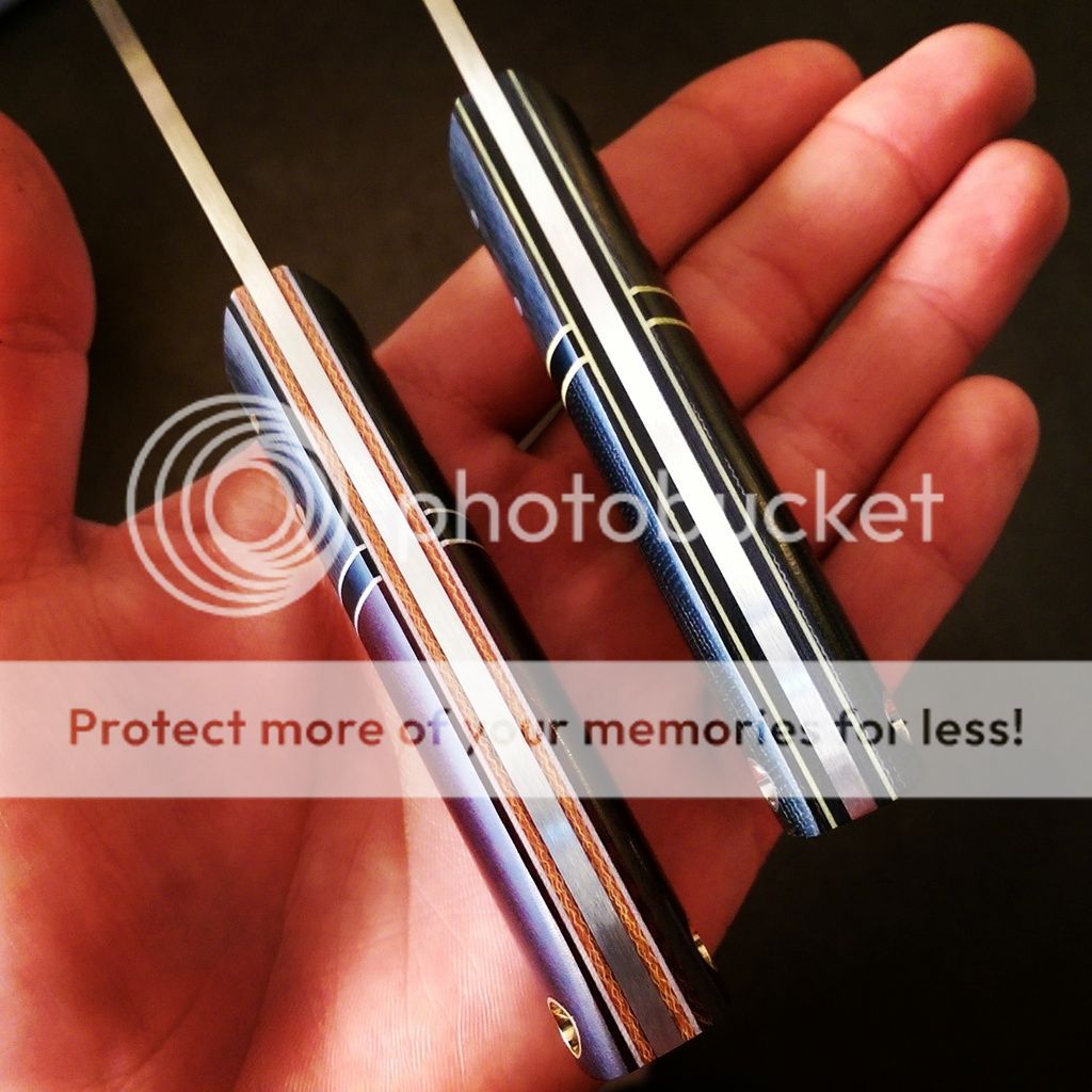 Scales on first are black micarta with yellow and black G10 liners/spacers, carbon fiber bolsters, and aluminum hardware. Second has maroon micarta, white and natural G10/Micarta liners, carbon fiber bolsters and brass hardware