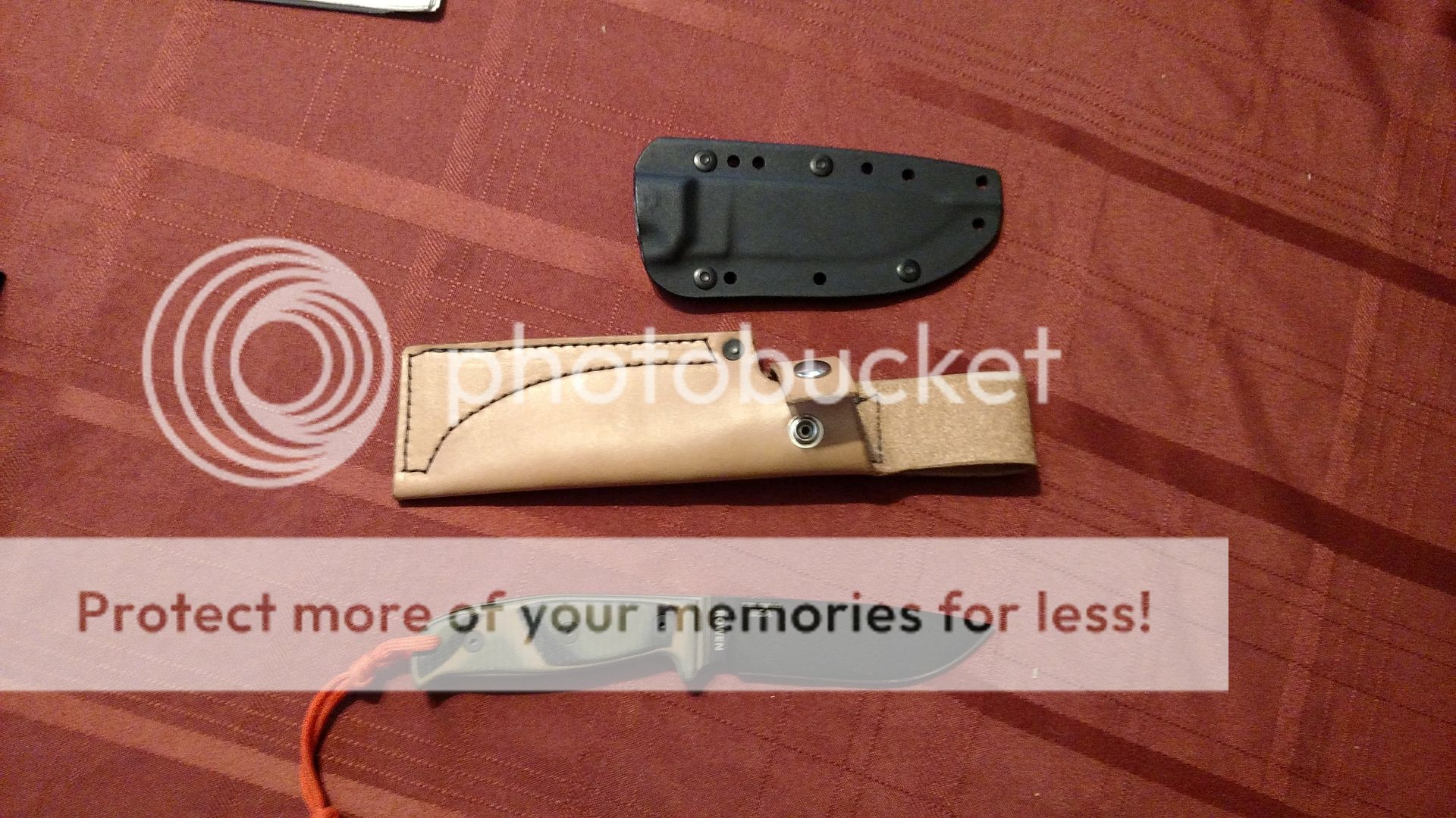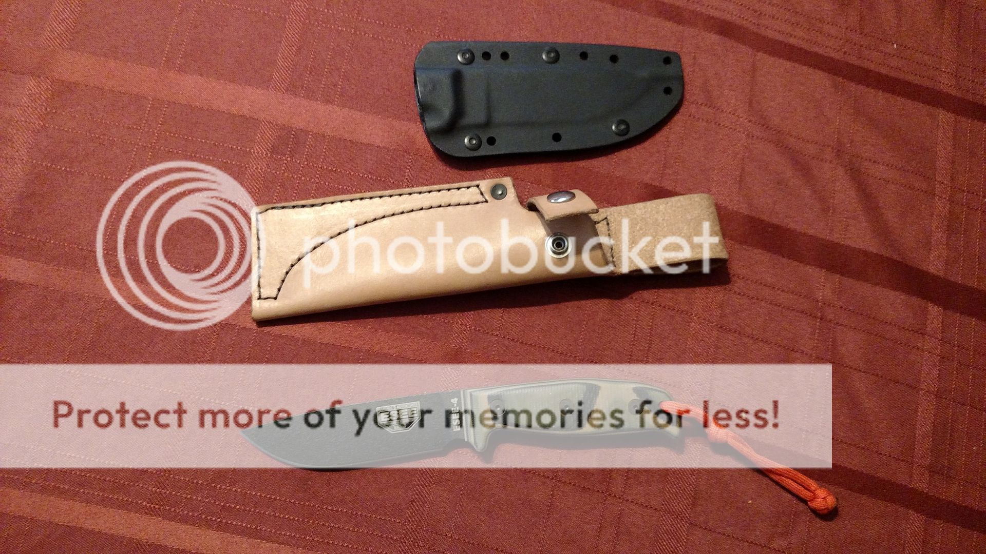 Esee 4 with camo tkc scales. Excellent condition. Only used a few times and was very light use. No visual blemishes that I can see. Comes with stock kydex sheath and leather sheath. $90 tyd.