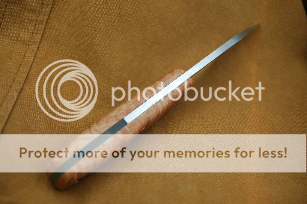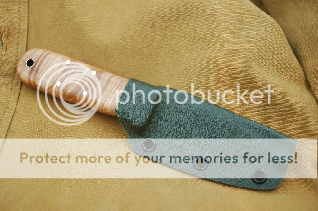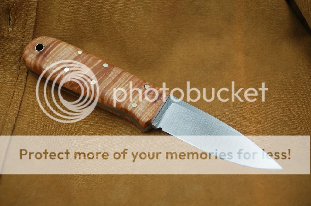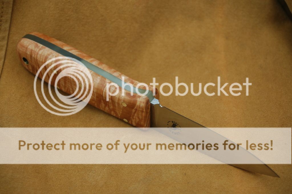 The drop point is a larger knife with micarta scales and jade G10 to fill out the handle. The spear point is smaller and has flamed maple scales, also finished with G10. Both knives are K390 @ RC 63 by Peters Heat Treat, right down the road from me in Meadville PA.