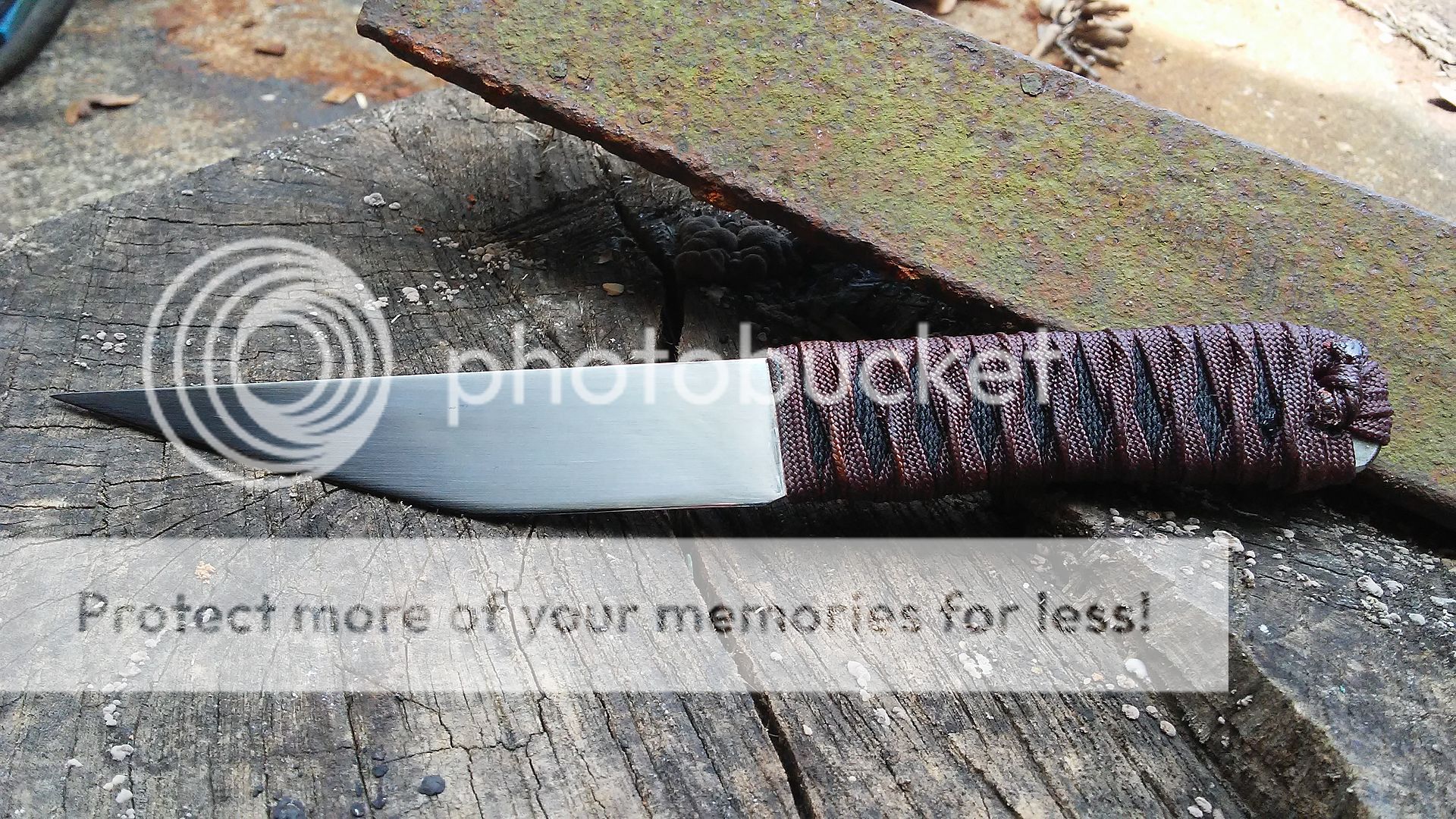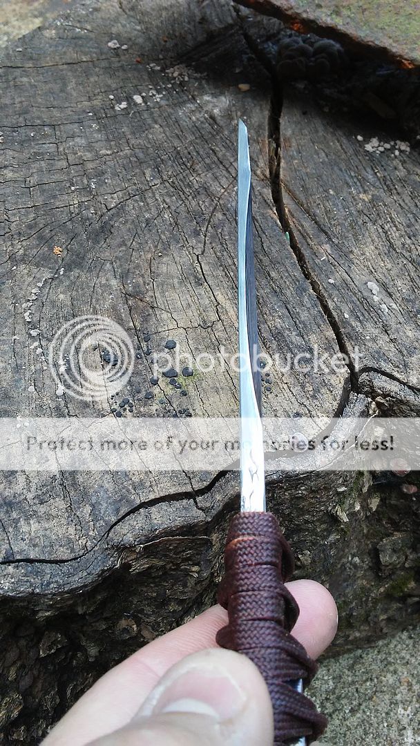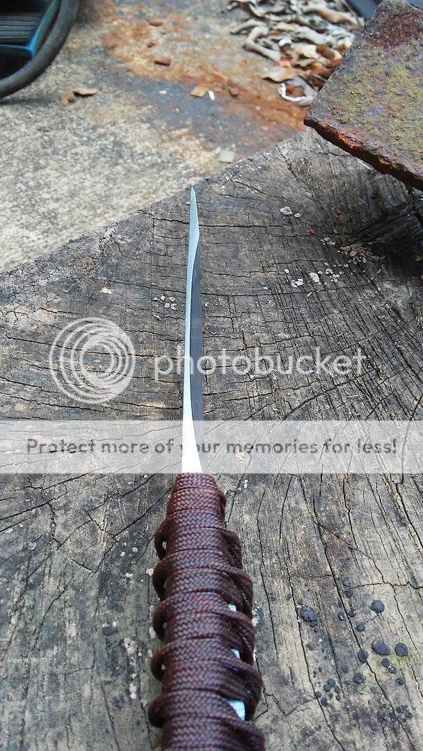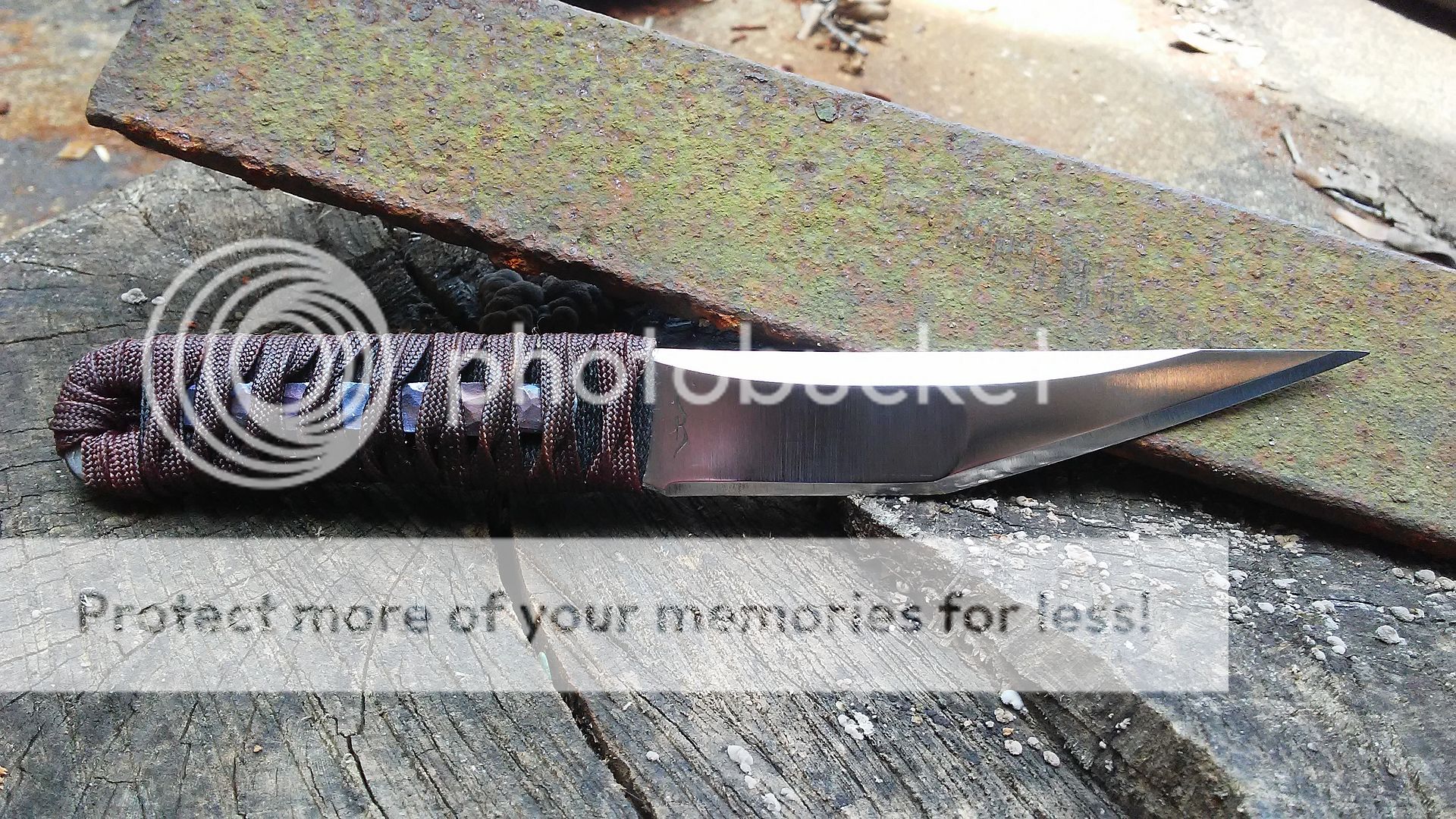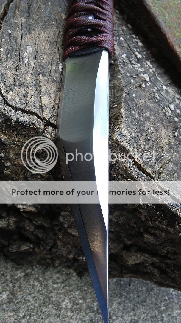 This kwaiken is made from 1095 carbon steel. It has been heat treated to 59-60RC in hardness. The blade is ground with a right side hollow chisel grind and the handle is wrapped with black cotton cord and over wrapped with dark red paracord that was coated with resin. It comes with a leather cross draw sheath. The menuki is made from titanium.
