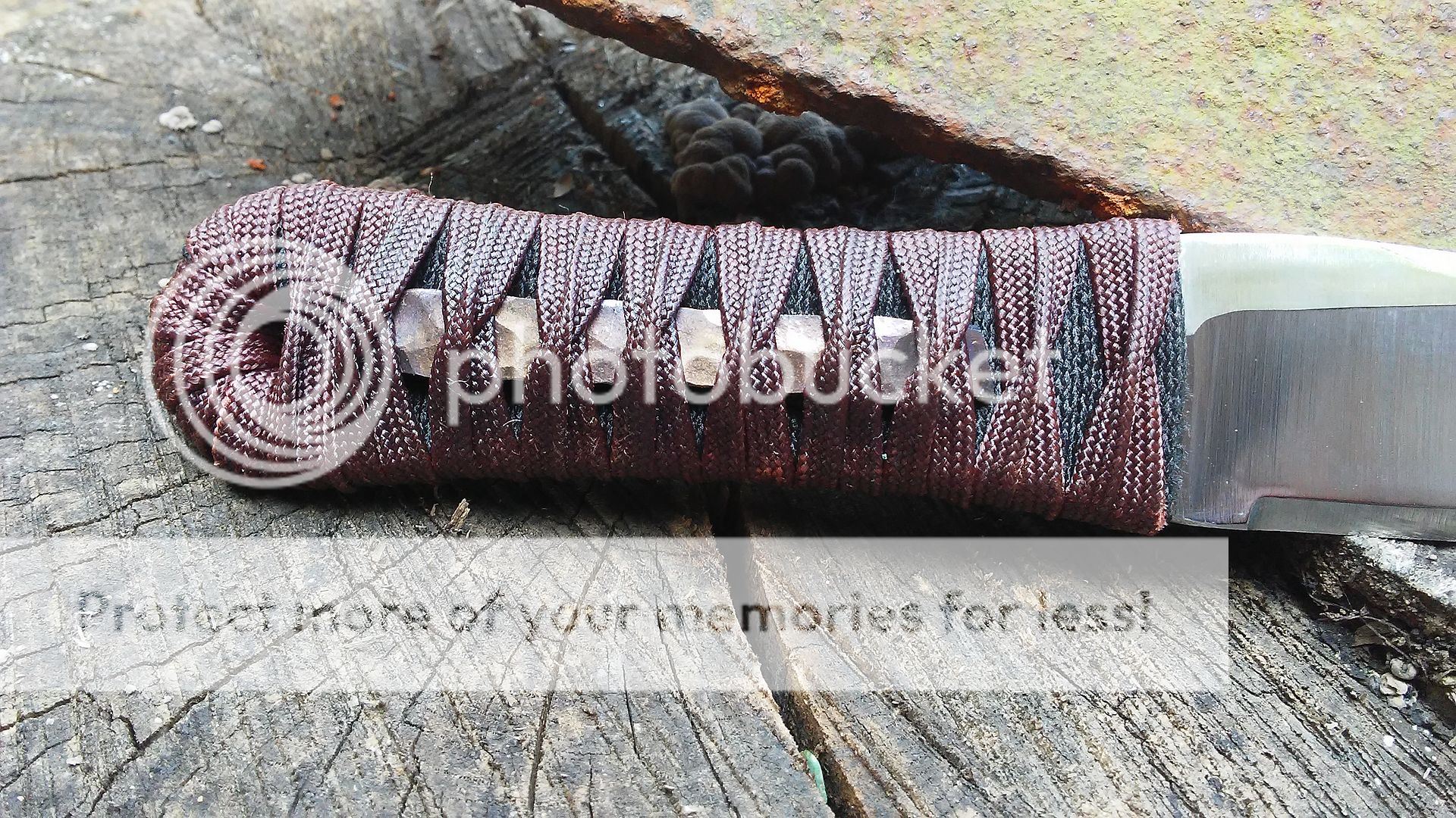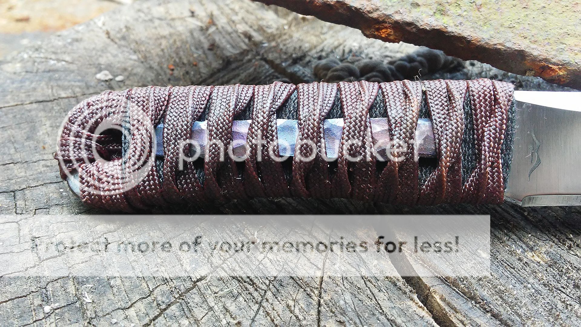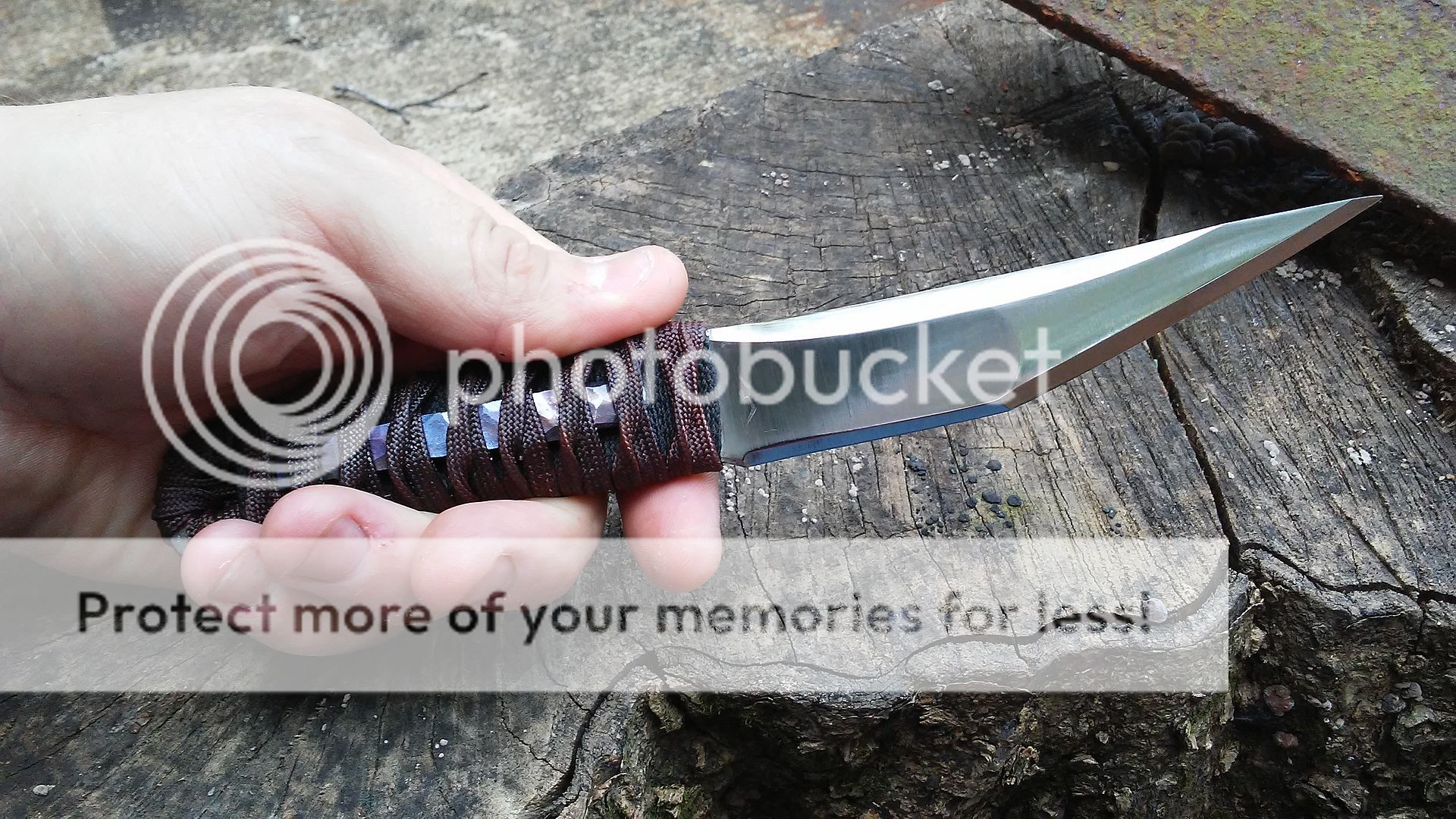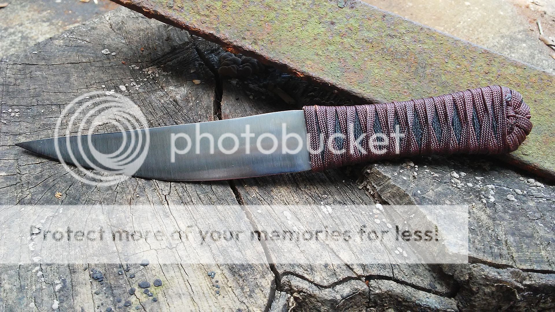 This kwaiken is made from 1095 carbon steel. It has been heat treated to 59-60RC in hardness. The blade is ground with a right side hollow chisel grind and the handle is wrapped with black cotton cord and over wrapped with dark red paracord that was coated with resin. It comes with a leather cross draw sheath. The menuki is made from titanium.