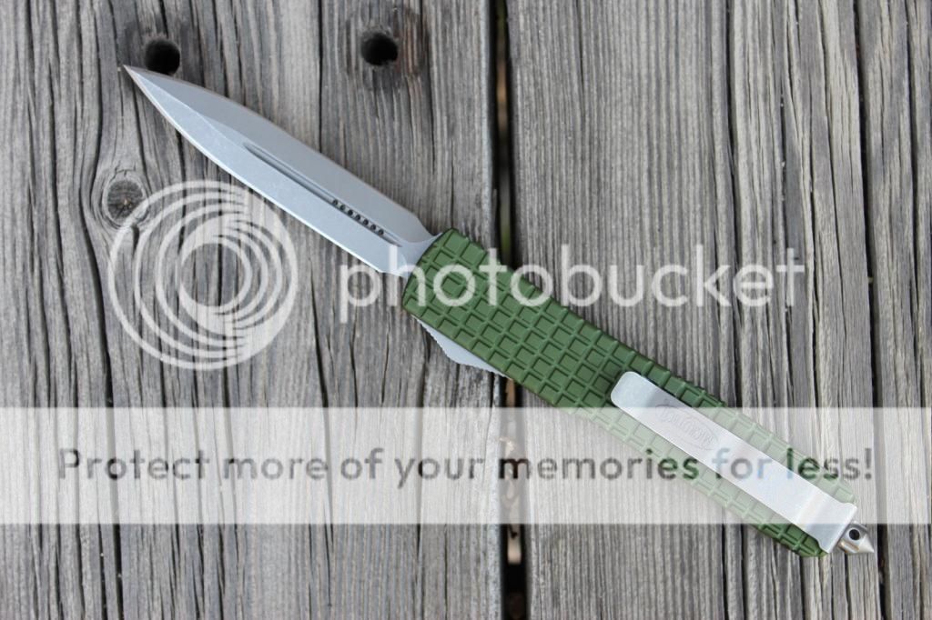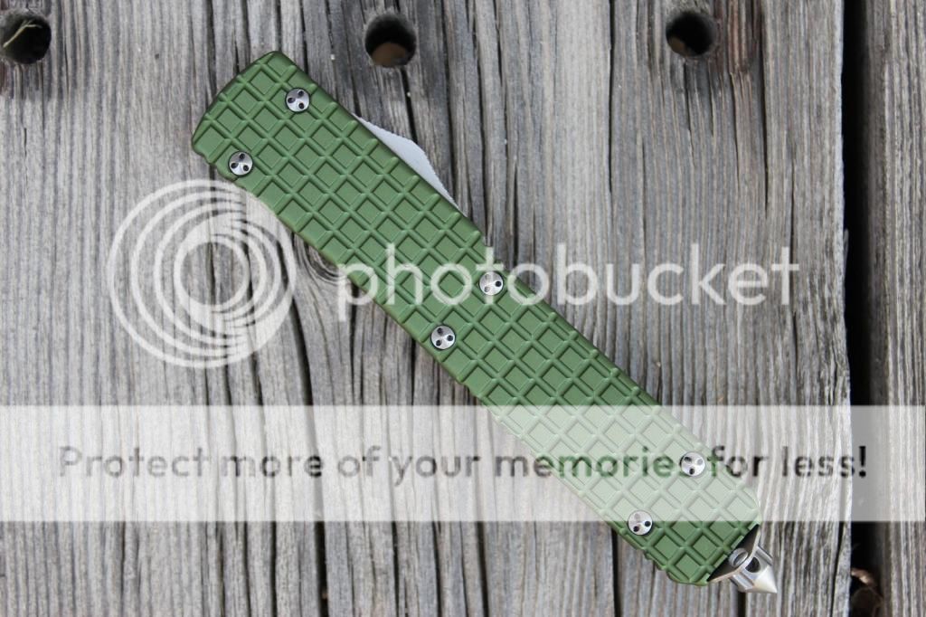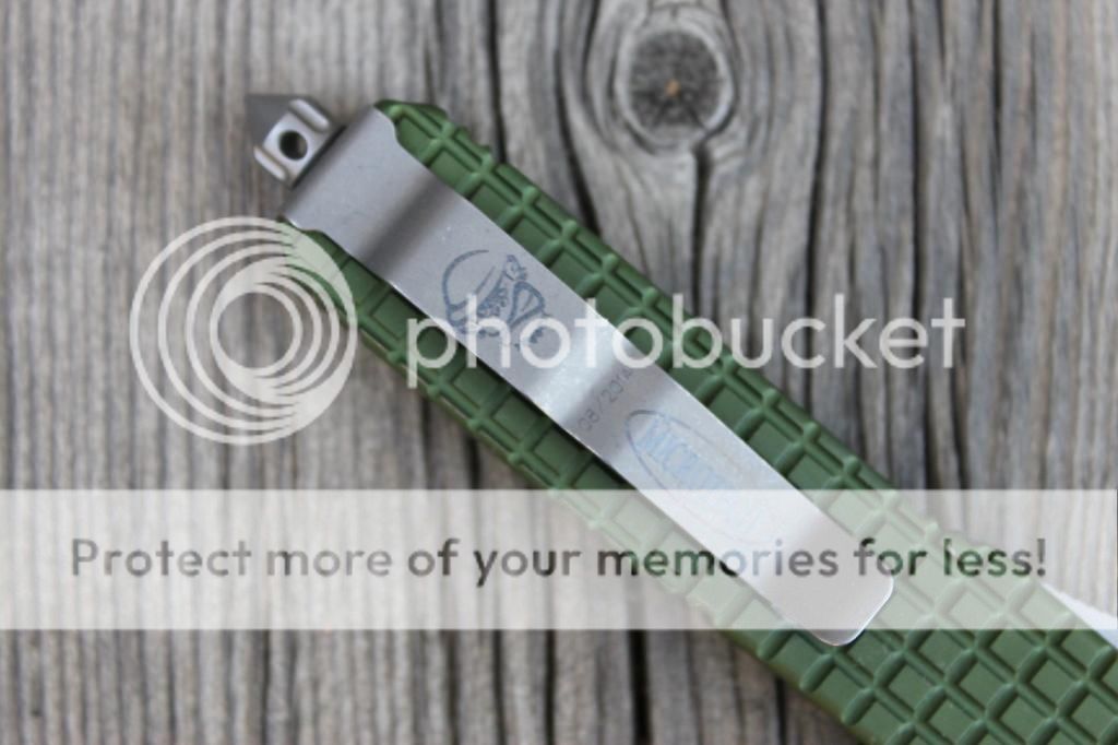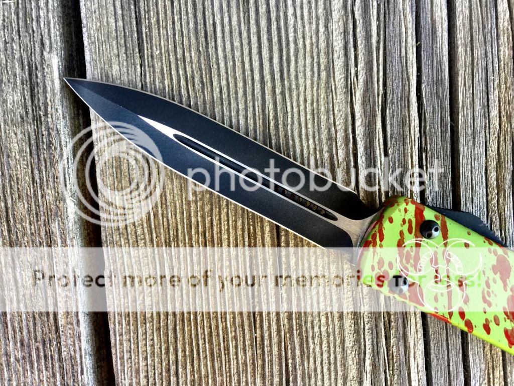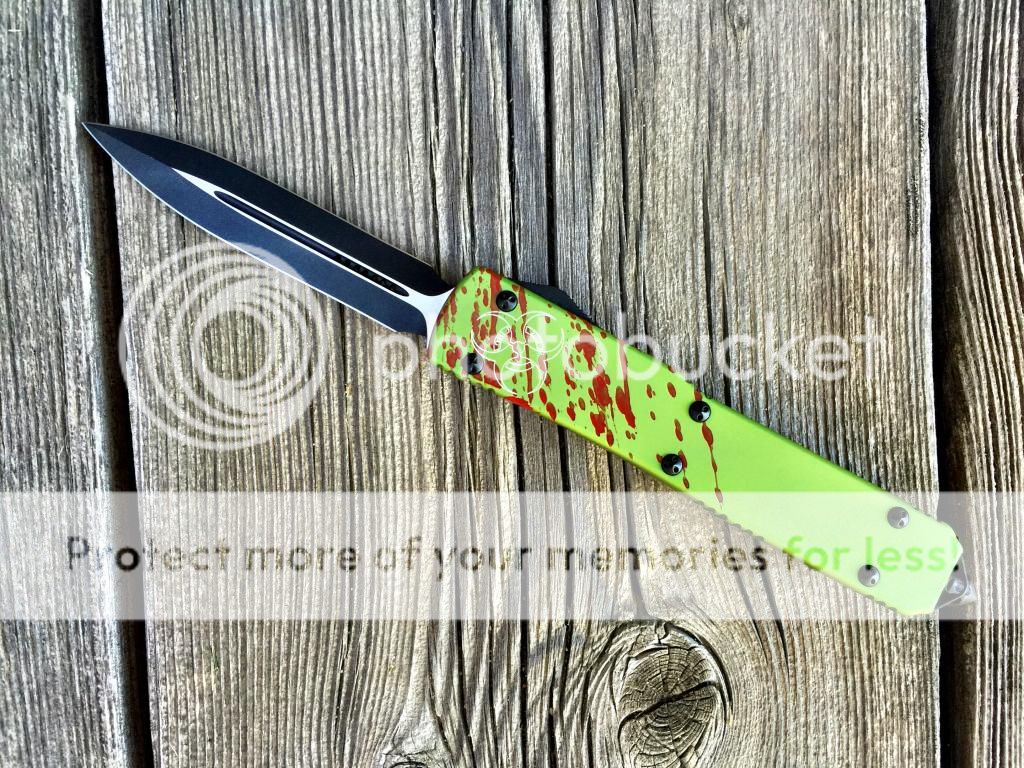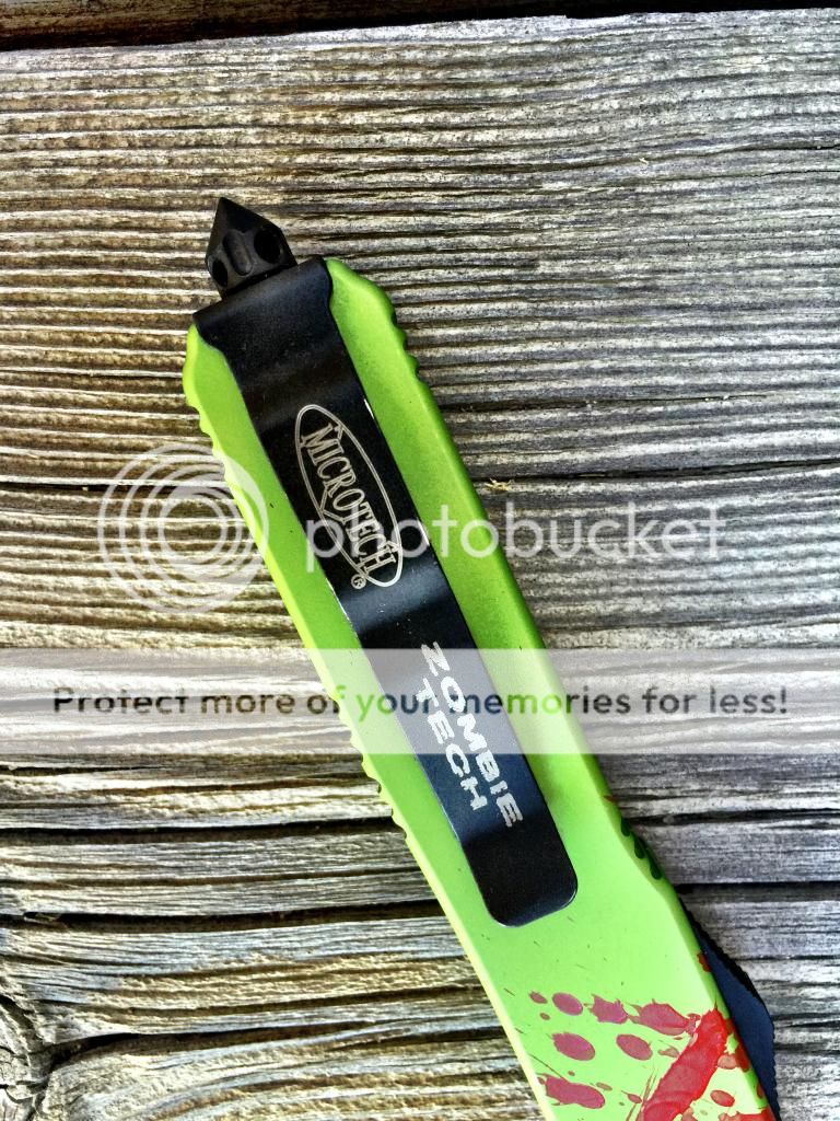 1) Microtech Ultratech - Zombie Edition - Comes with drawstring MT bag, no box. These are no longer produced. Clip shows some very light wear from a little carry. Blade is flawless, great action! Cool spatter pattern on handle. Asking $old