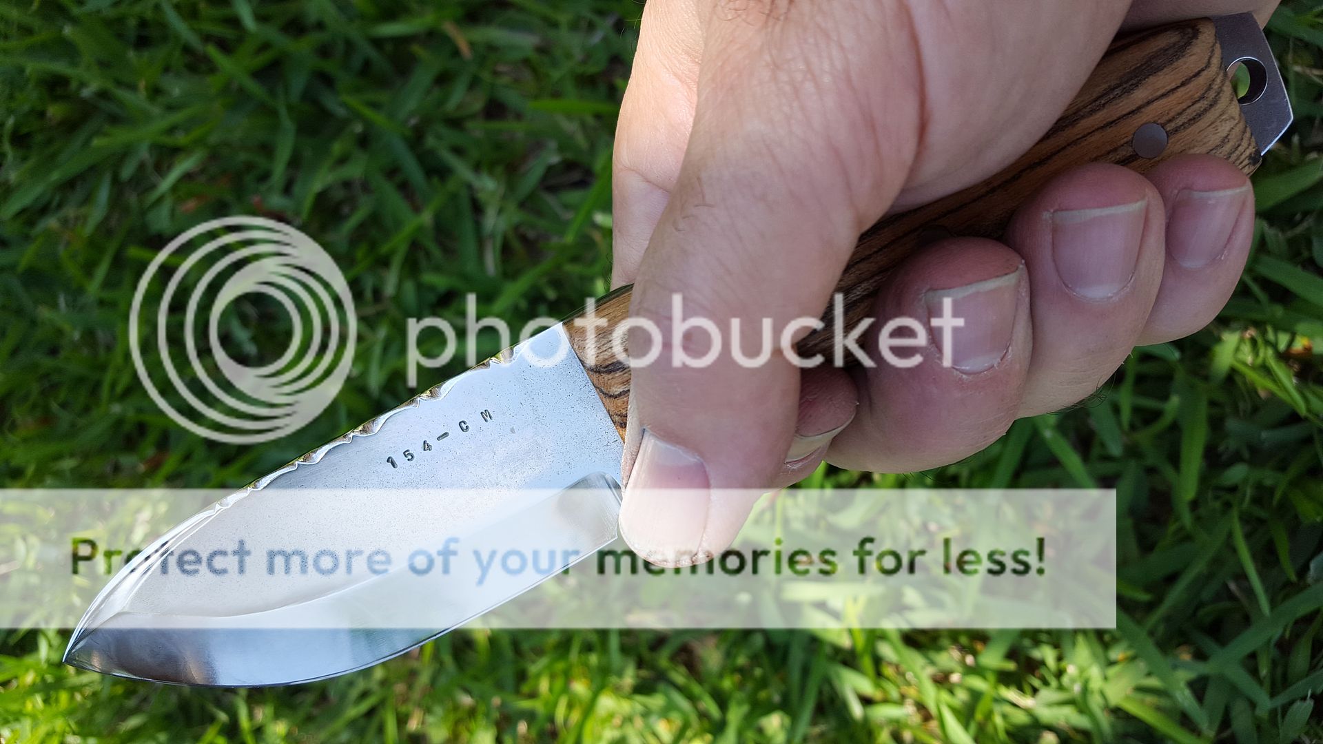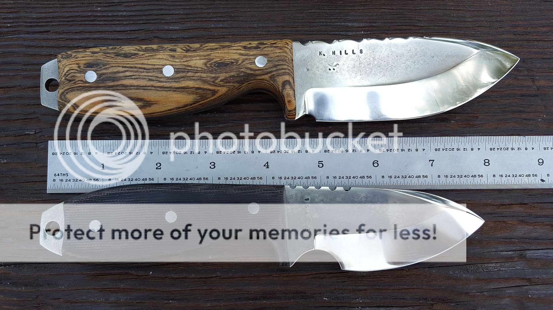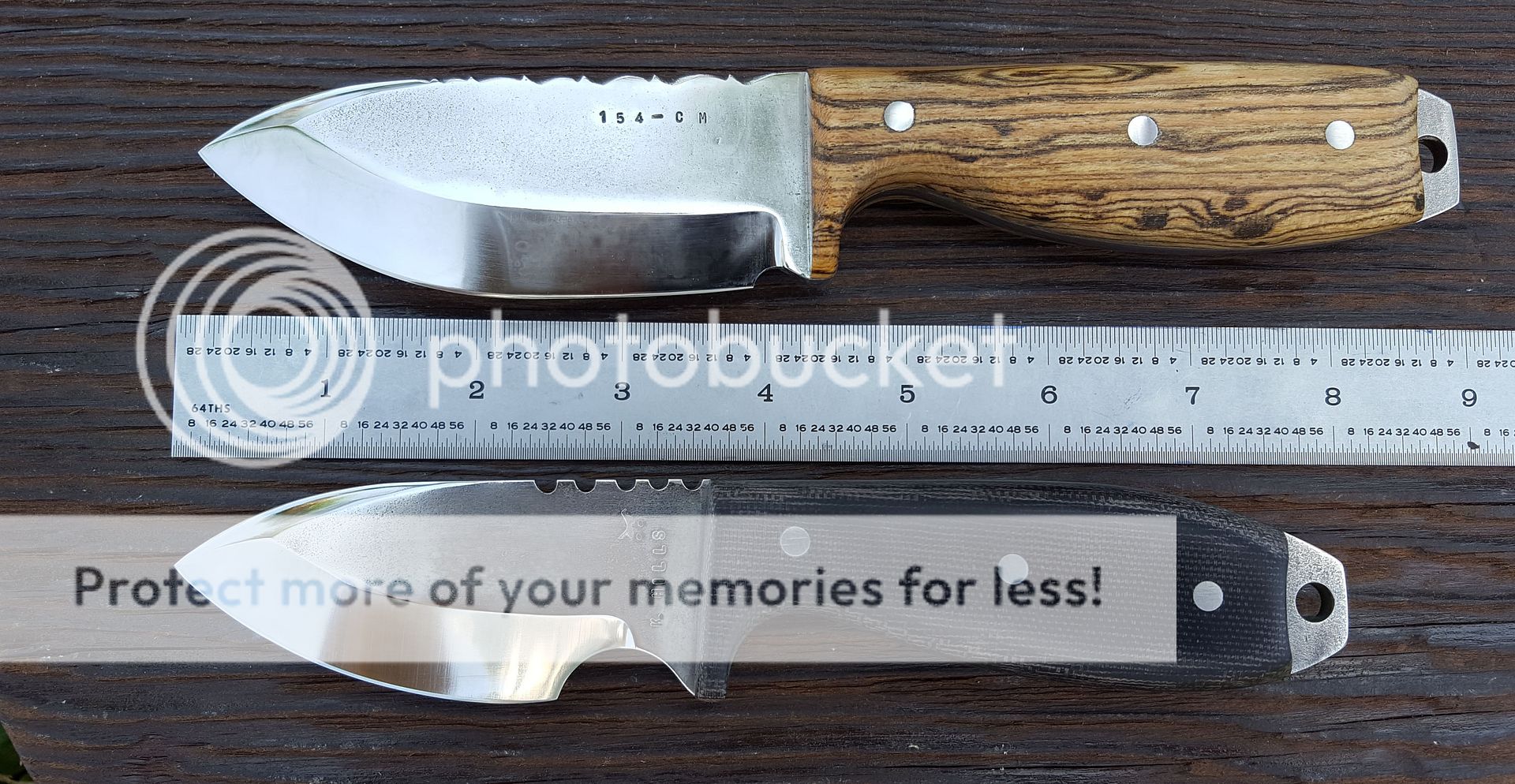 Finished the two Skinner/Hunter knives, so up for sale they go. Both are made from Aldo's 3/16ths 154-CM and both are hardened to a Rockwell of 60.