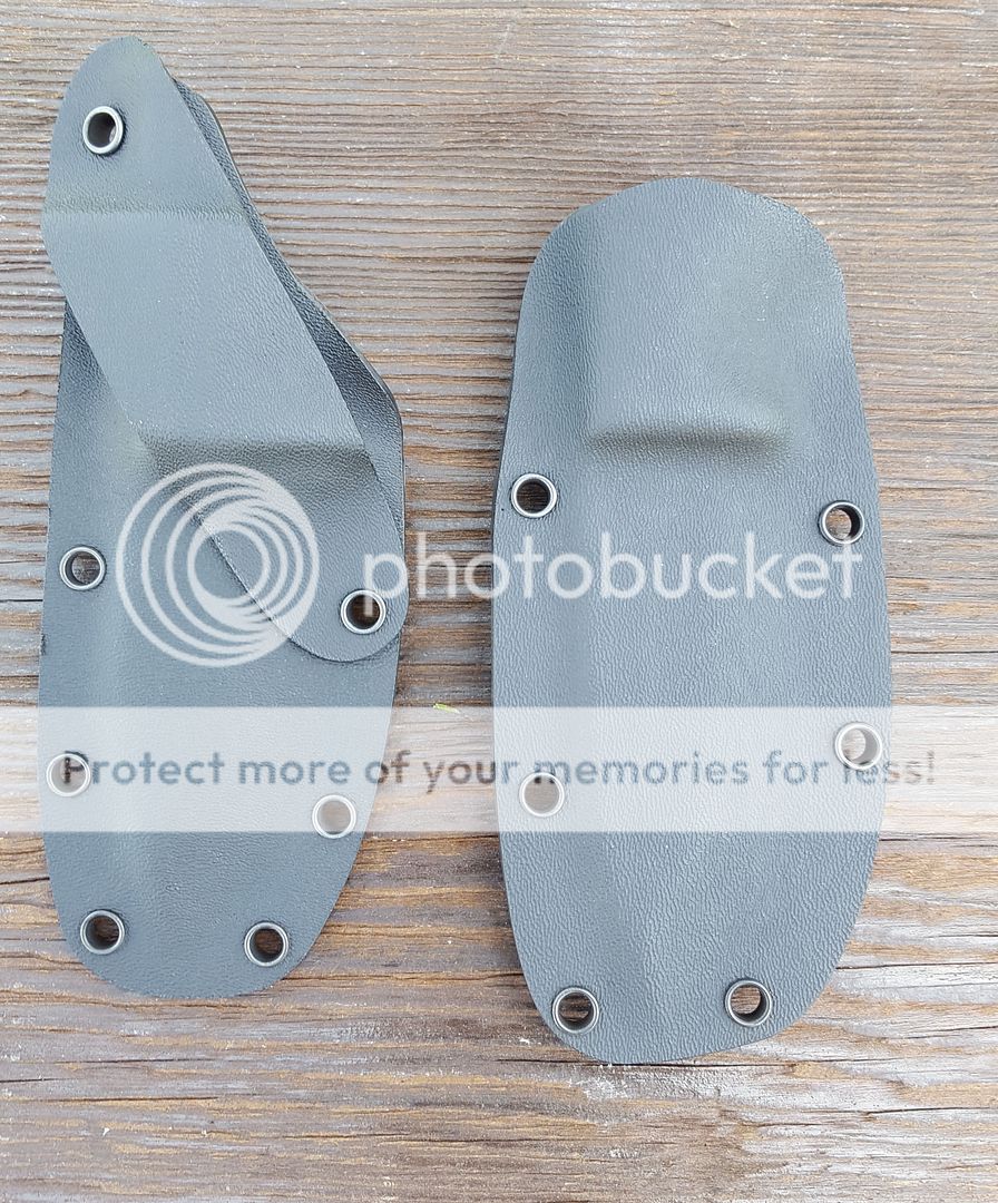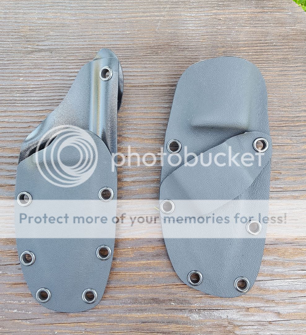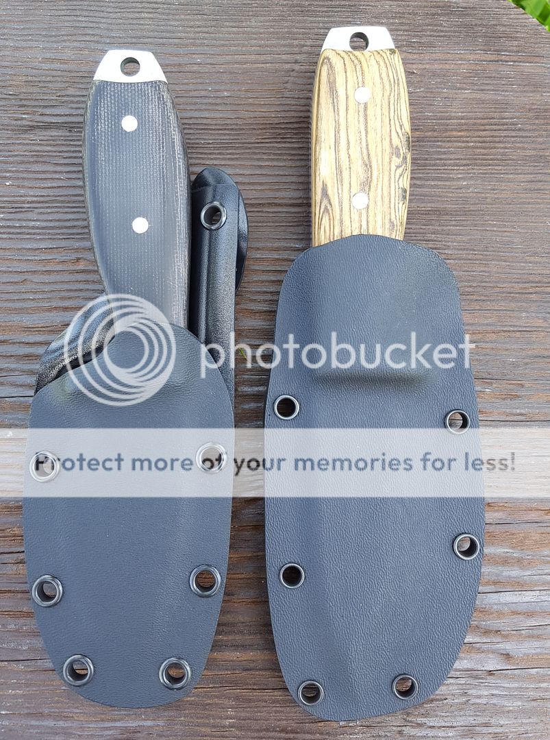 A word on the sheaths.They are hand made by me and custom to each knife. Made from .080 Kydex. The one for the smaller knife is worn in a traditional fashion on the outside of the belt in the vertical presentation. The one for the larger knife fits between the belt and the pants, in the small of the back,right hand draw. Or cross draw from left hip with right hand.