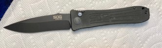 Sog TAC auto. Aluminum handle. Fit and finish flawless. Except one small hard to see snail mark on blade. Opens hard locks up $90 all in