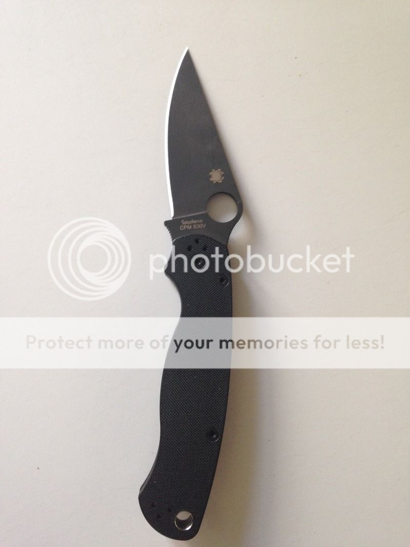 Black/black s30v. Light user, blade touched up on Sharpmaker white stones. G10 shows some wear mainly from a drop. Blade is centered action is perfect. Box included. $95