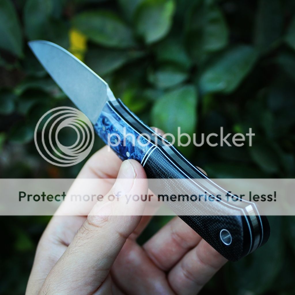 Scales are stabilized blue burl with black micarta. White G10 and black micarta liners.