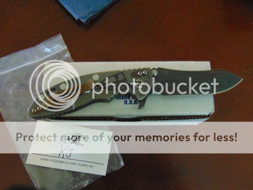 Secondly is a totally decked out Hinderer XM18 Battle Black Skinner with a custom broze shield/cross clip, filler tab, copper/bronze hardware, distressed black G10. Decked out from top to bottom. Comes with box/bag/peanuts. All original hardware included (Save for clip). LNIB save for one tiny scratch near pivot screw (Happened during installation of the new hardware). Excellent action, centered, early lockup. Asking