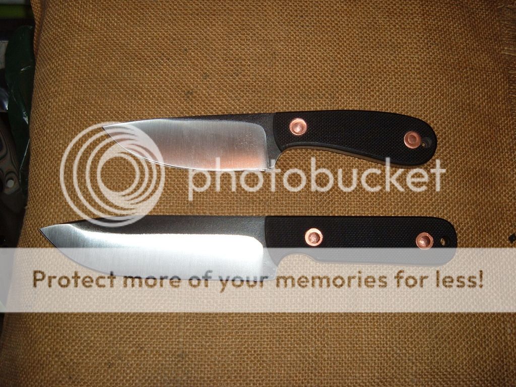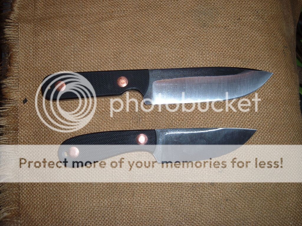I have two utility designs available. The handles on these are inspired by the old leather scaled Mt Man throwers I used to carry when I was younger. Instead of leather slabs though, I used 1/8in thick, rough textured black G10 with copper harness rivets. Mill scale was left on the flats of the 5160 blades. Both come with Kydex sheaths set up for large Tek Loks(not included). Price of each one is $175 shipped in the US.