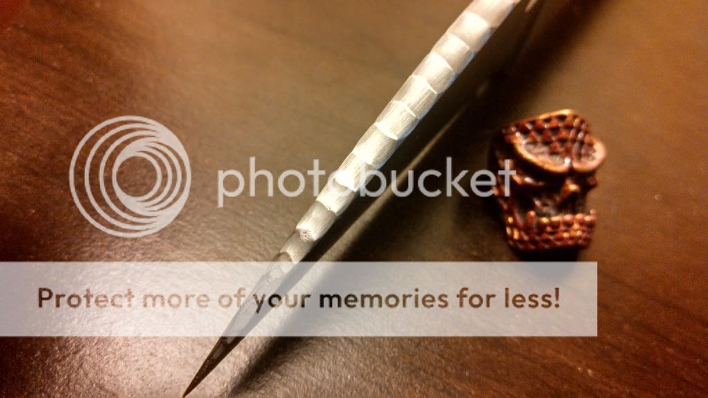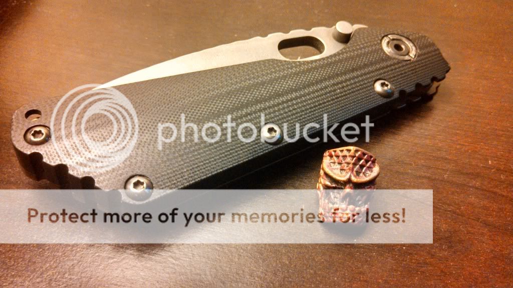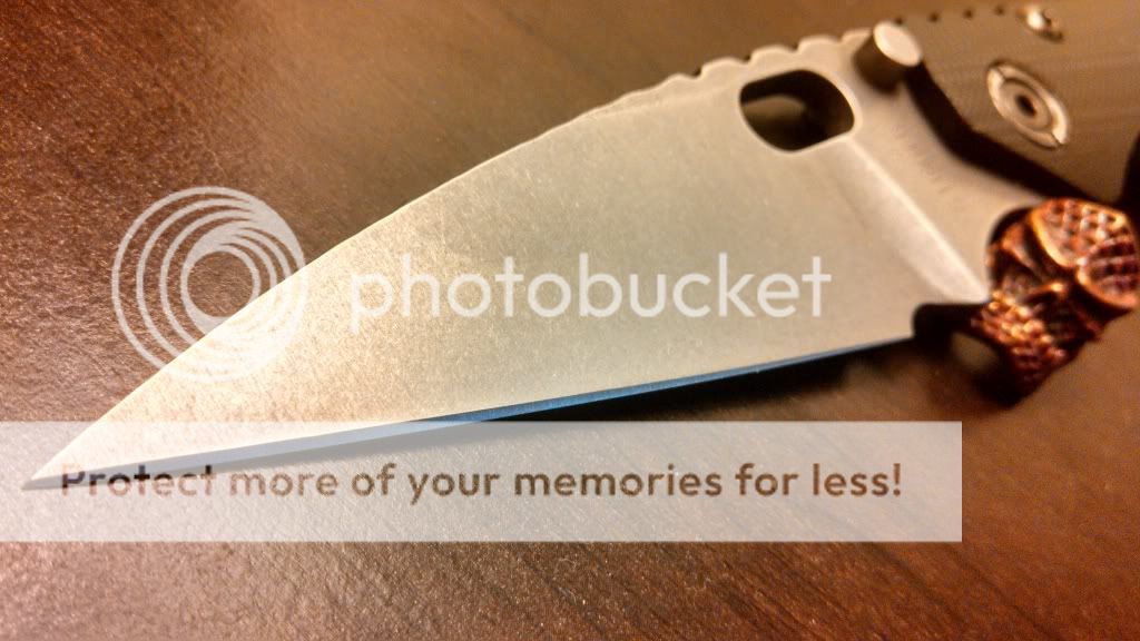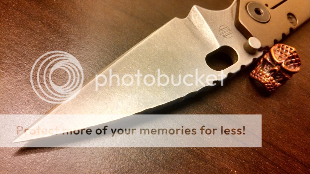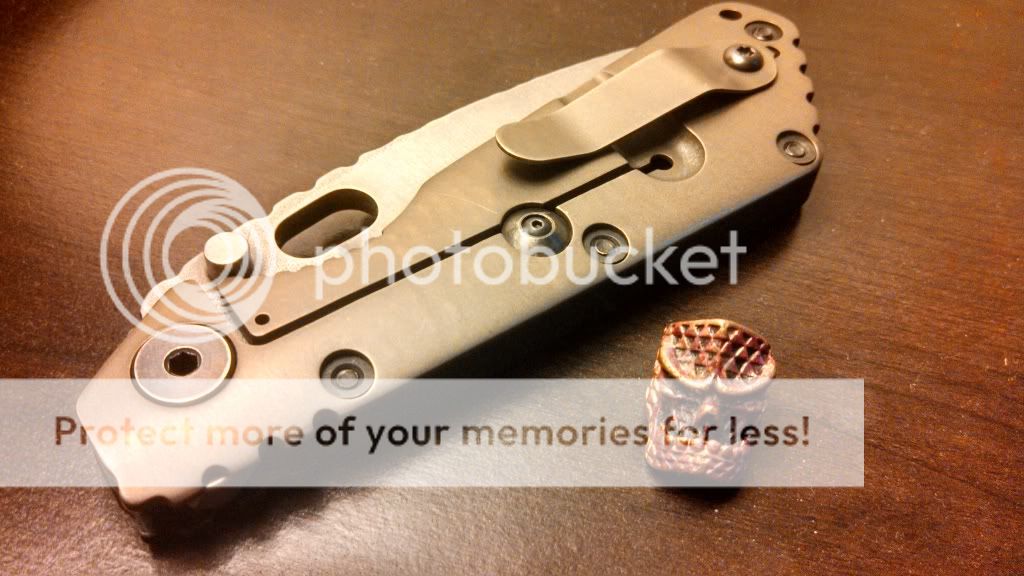 Up for sale is a very unique Strider SMF. This guy started life out as a DLC coated flat ground drop point blade black CC SMF with heat anodized titanium lockside. After a vacation in PA it came back acid bathed then stonewashed, wharncliffed, bronzed, and had some very cool spine work done to it.
