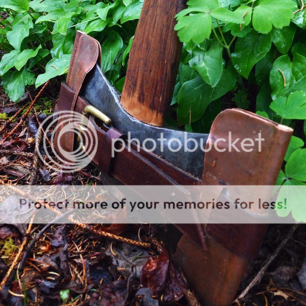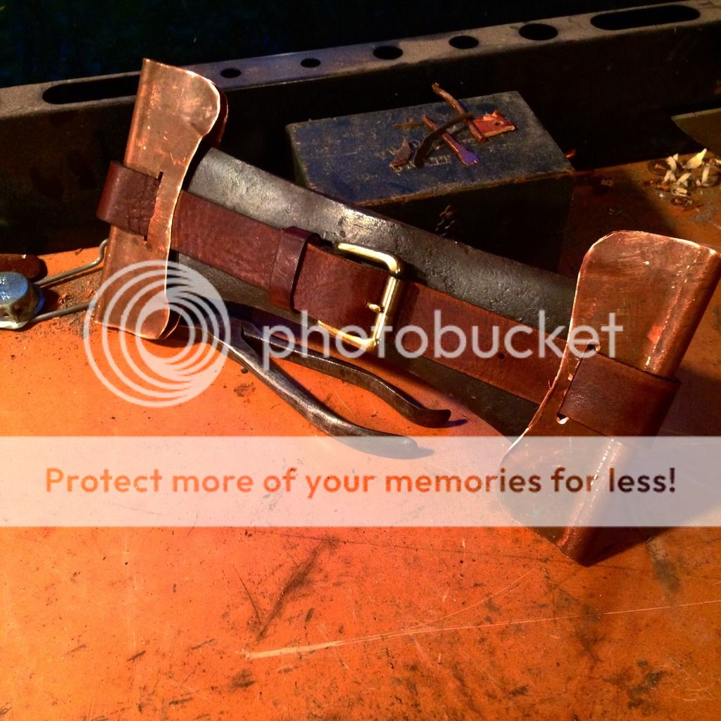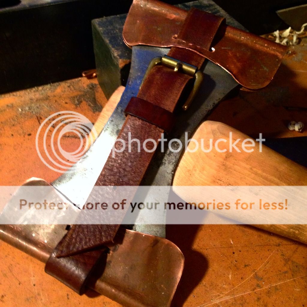Hey guys, just thought I would share this here too, if you haven't seen it already. Here is a sheath I made based on the original steel USFS design. I decided copper would be prettier and better on the axe. There are dowells in the ends of each mask to protect your edges. Also, it is adjustable, and will fit any double bit I own!