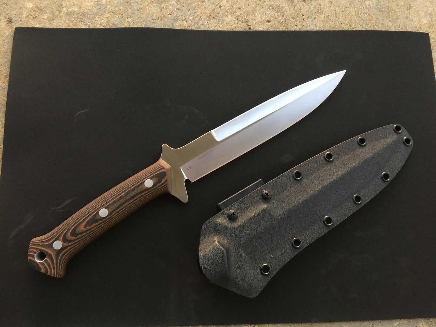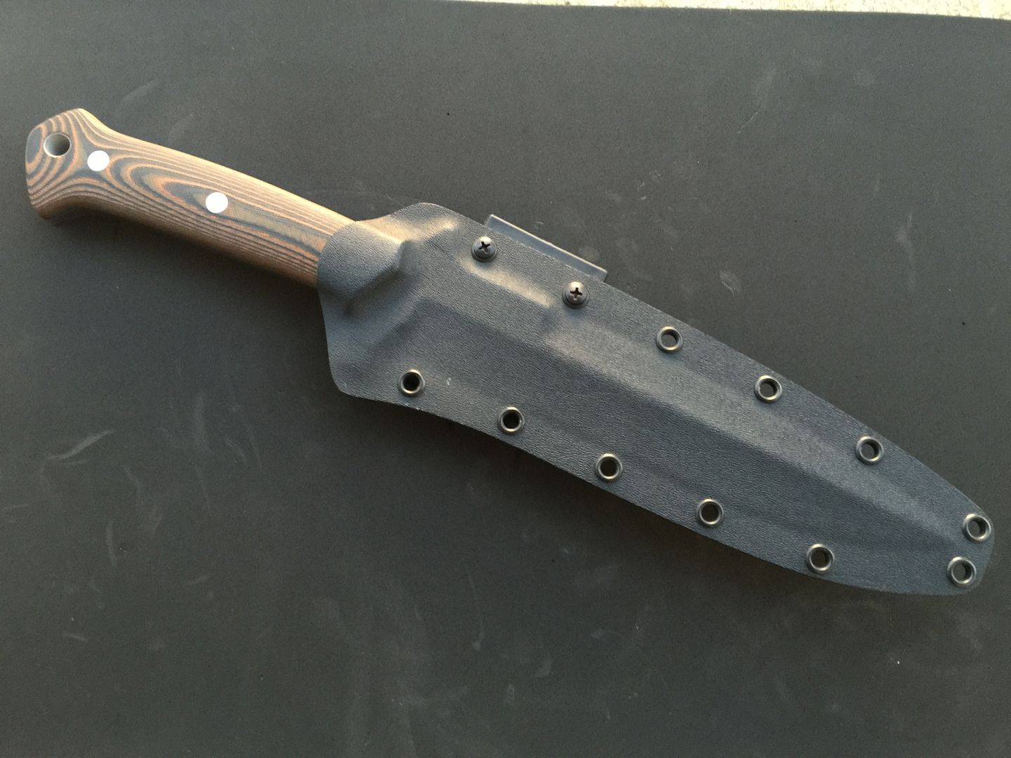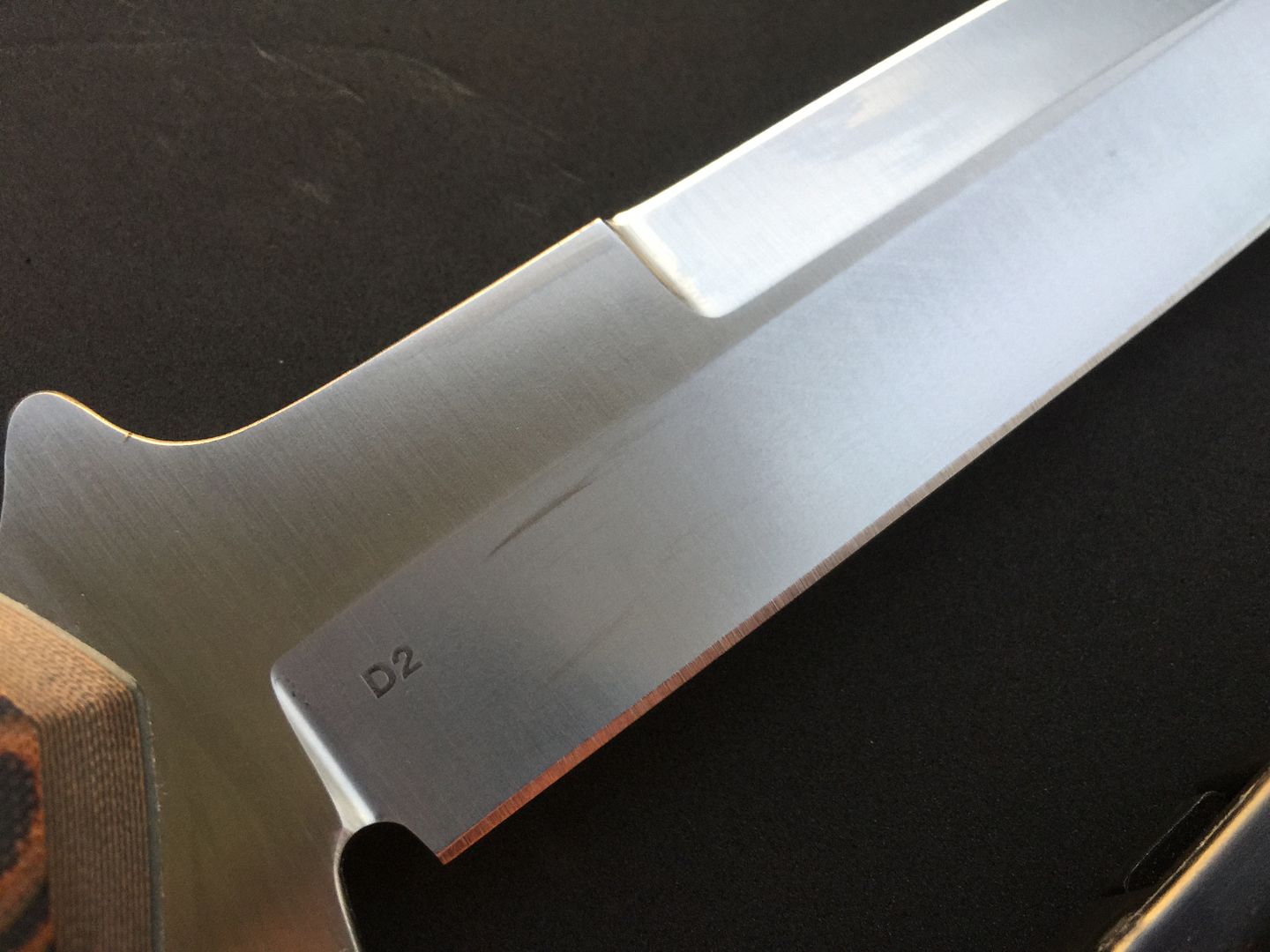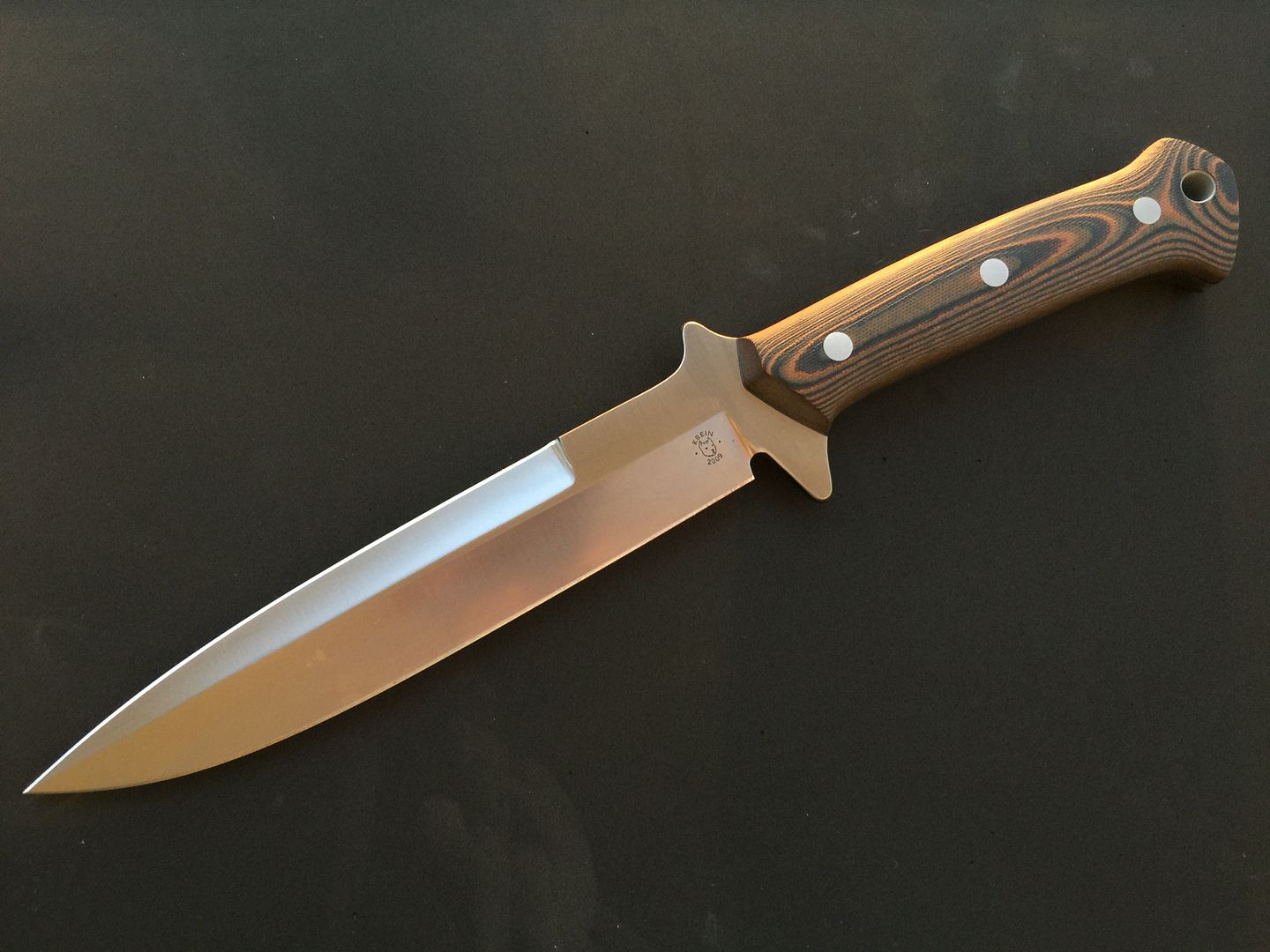 Up for sale is my Krein Ultimate Boar Knife (UBK). It has D2 steel and pumpkin G10 scales. I am the original owner, and ordered it directly from Tom when he was still taking custom orders. It is 100% unused. I'd call it mint, except that the knife has been drawn from the sheath, therefore it has the normal kydex marks. I've tried to show any marks in the photos, but they are all minor and look worse in the photos. Knife has never been carried, never cut anything (even paper), and is in excellent, excellent condition. Comes with Tom's sheath. Tom never made many of these to begin with, and I have only seen a few come up for sale in recent years. I can pretty much guarantee you'll be happy with the knife's condition!