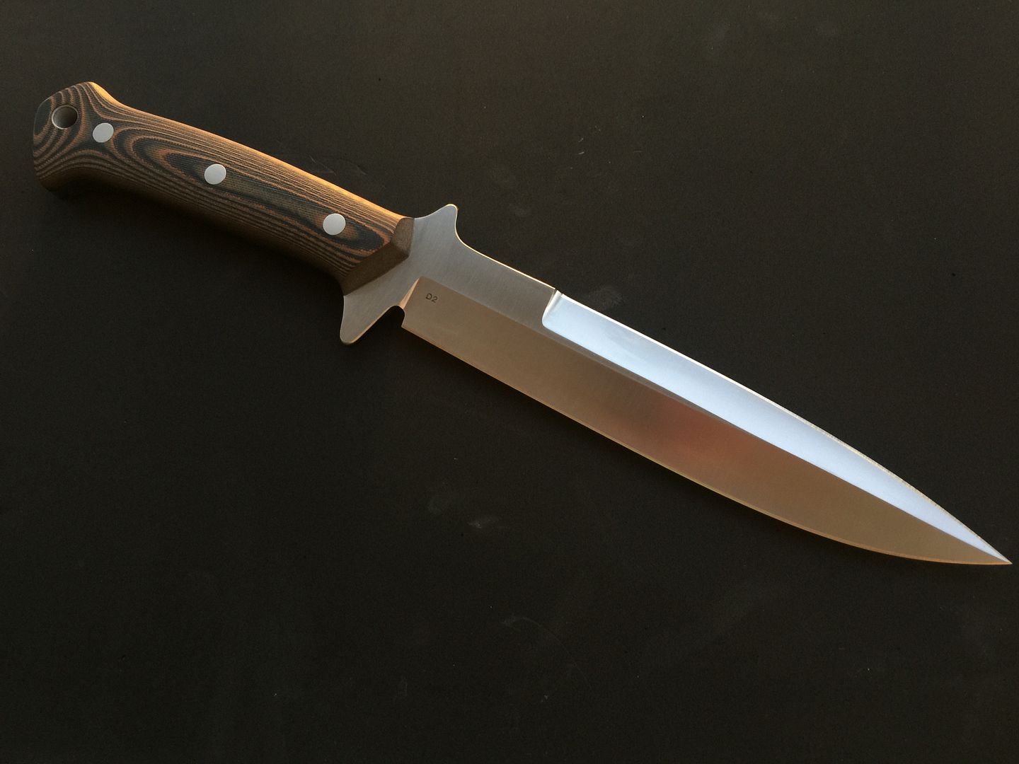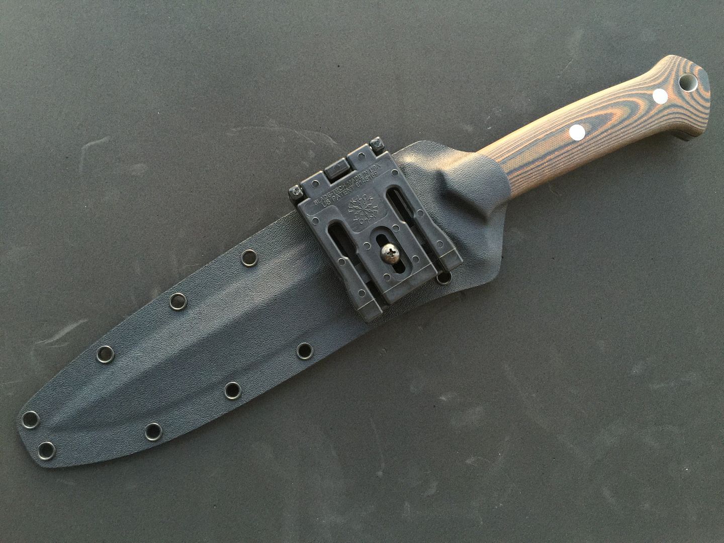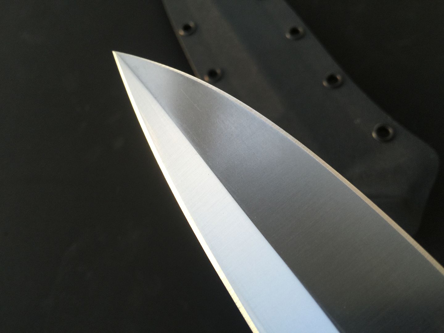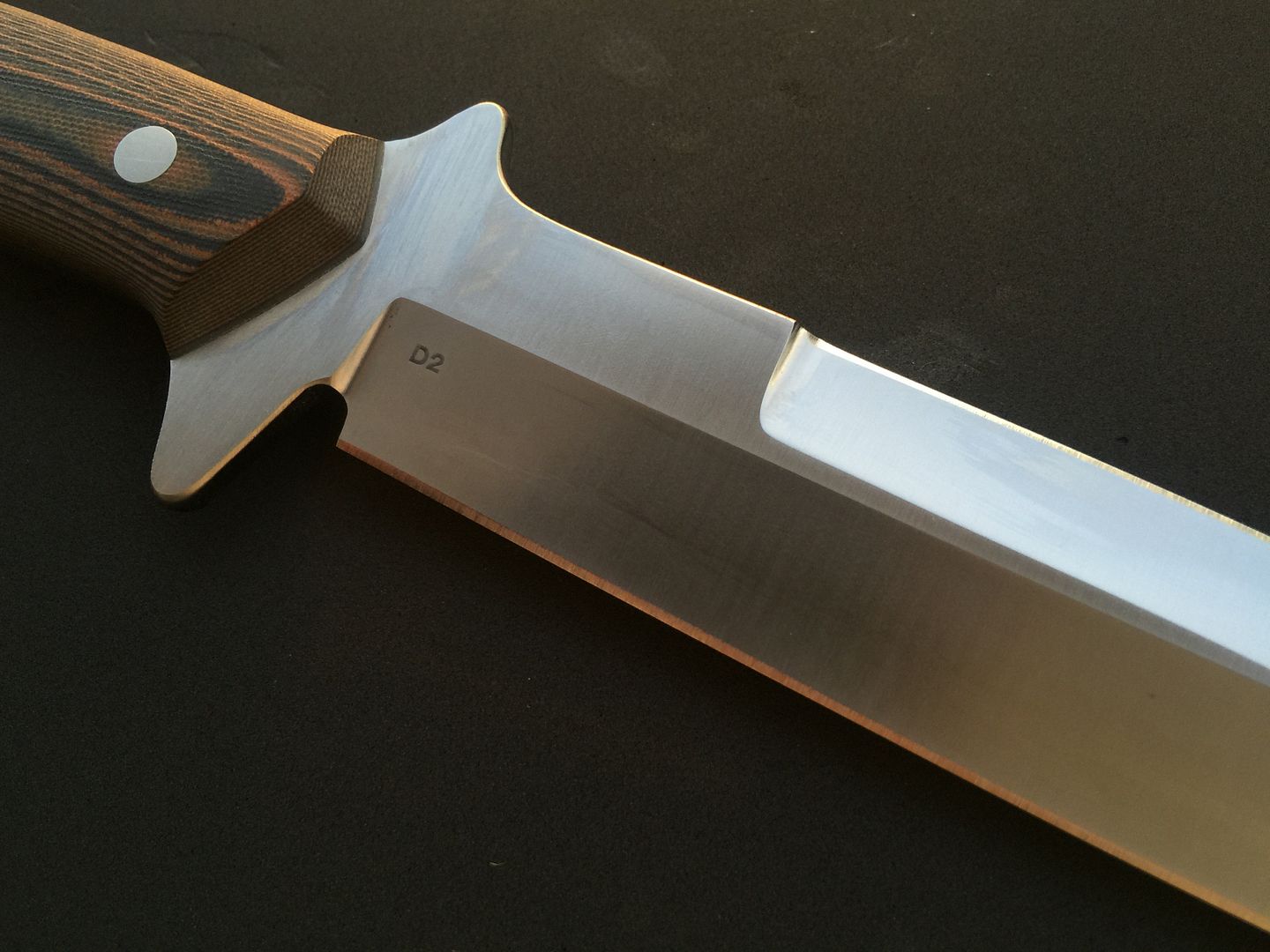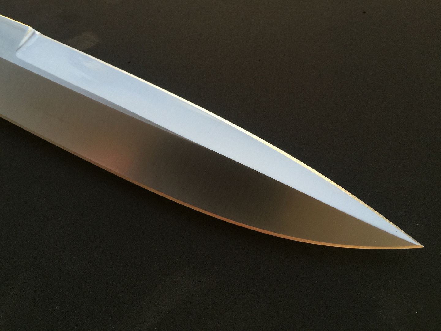 Up for sale is my Krein Ultimate Boar Knife (UBK). It has D2 steel and pumpkin G10 scales. I am the original owner, and ordered it directly from Tom when he was still taking custom orders. It is 100% unused. I'd call it mint, except that the knife has been drawn from the sheath, therefore it has the normal kydex marks. I've tried to show any marks in the photos, but they are all minor and look worse in the photos. Knife has never been carried, never cut anything (even paper), and is in excellent, excellent condition. Comes with Tom's sheath. Tom never made many of these to begin with, and I have only seen a few come up for sale in recent years. I can pretty much guarantee you'll be happy with the knife's condition!